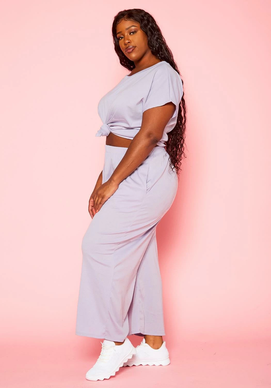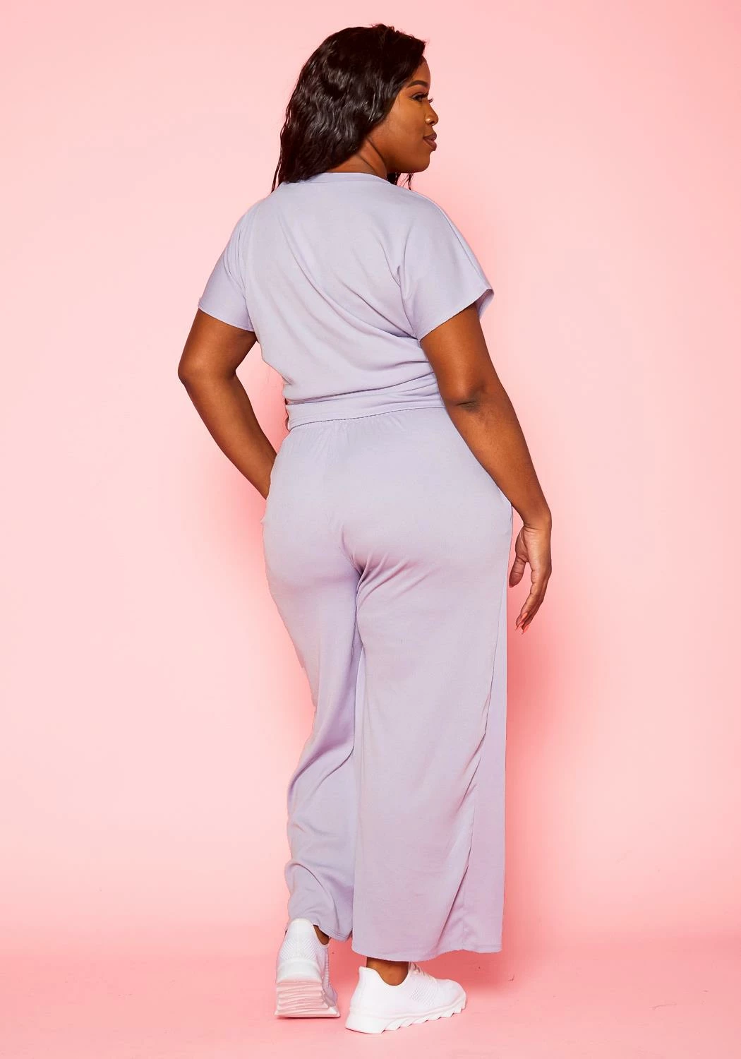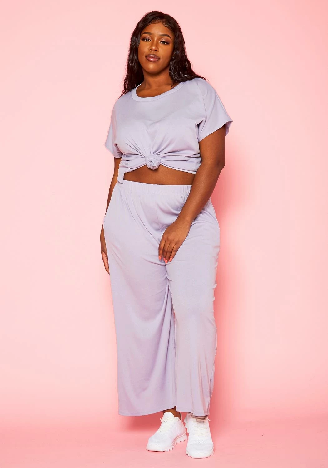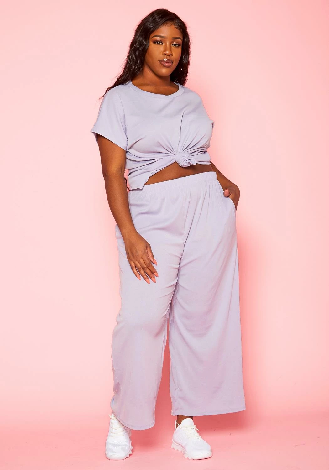 Perfect lounge outfit for plus size women which features a crew neck t-shirt and matching color wide flare pants.