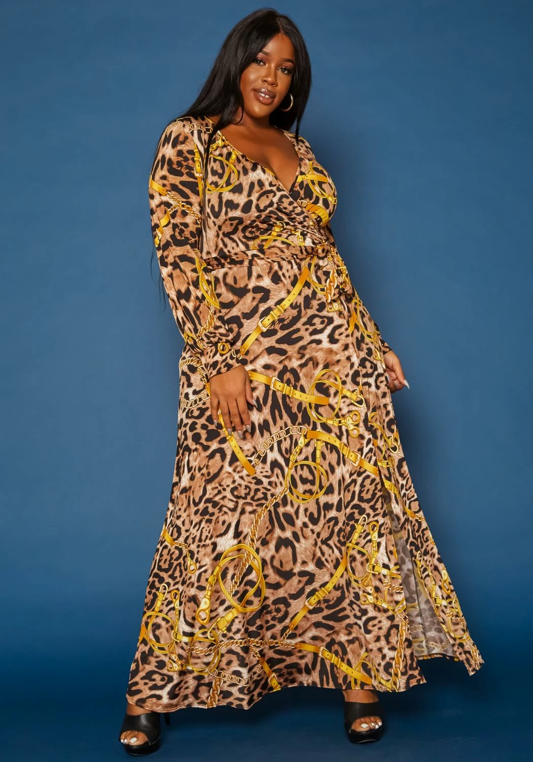 Unique plus size women’s fit & flare maxi dress in v-neck style, long sleeves with fitted wrist cuffs, wrap design and slit hem.