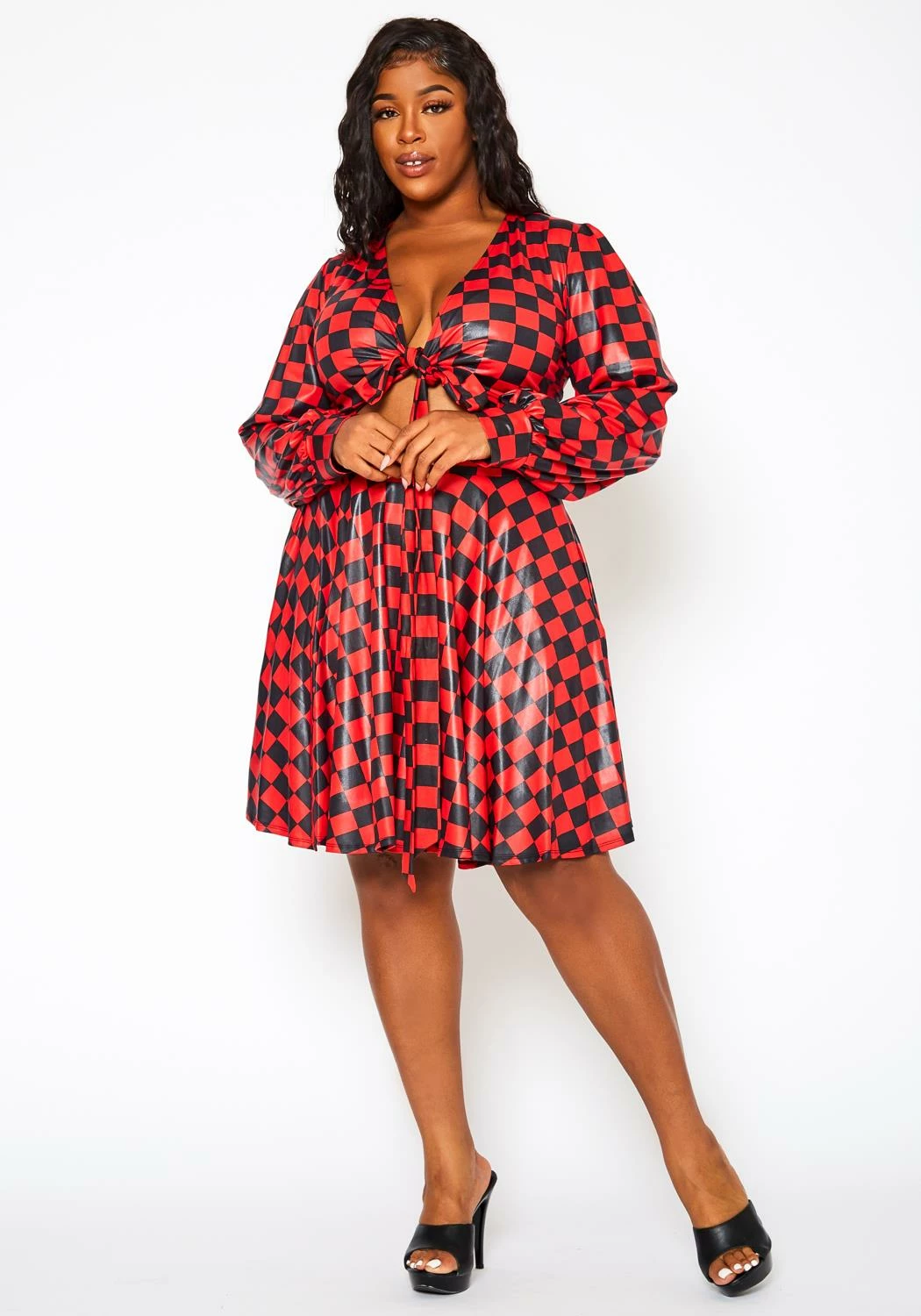 Statement two piece set for plus size women in faux leather checkered print. Features a v-neck style, long sleeve wrap blouse and high waist pleated flare mini skirt.