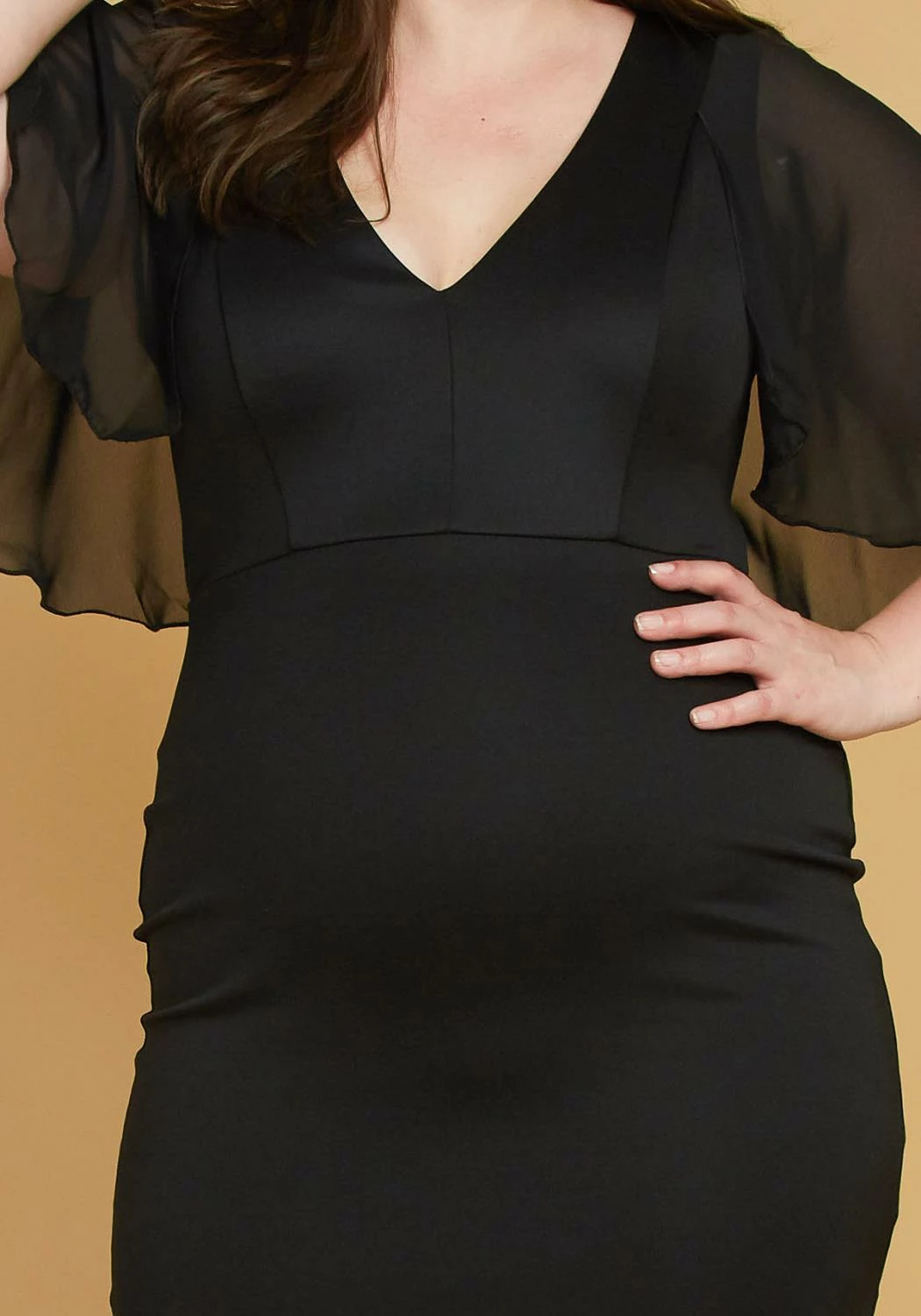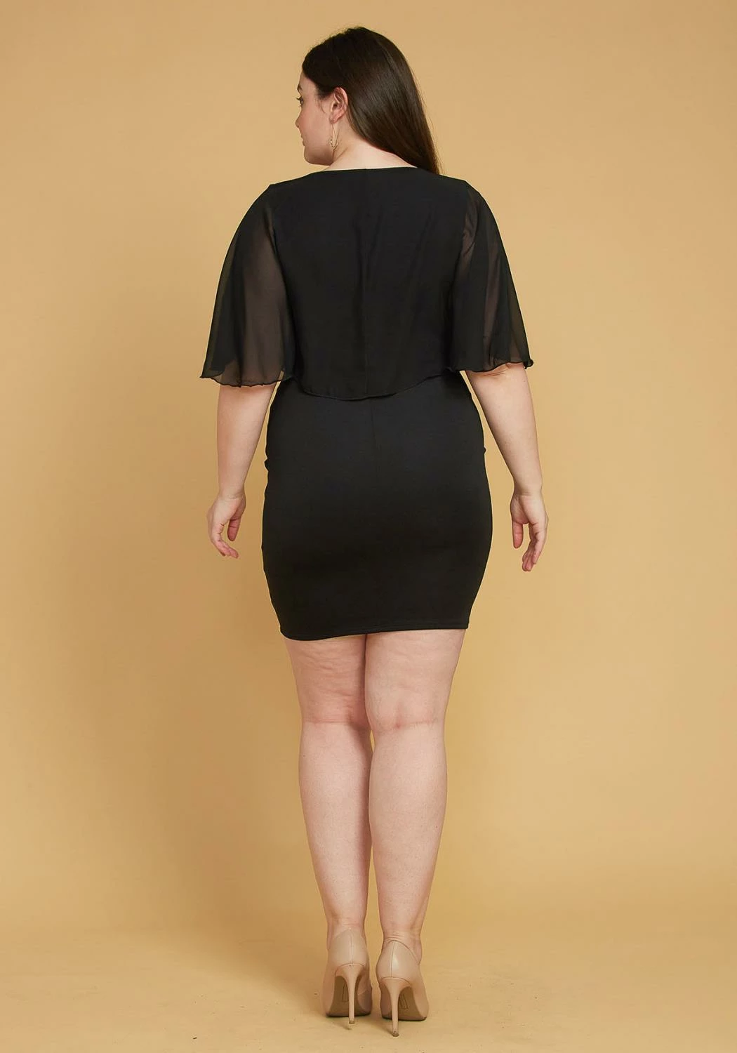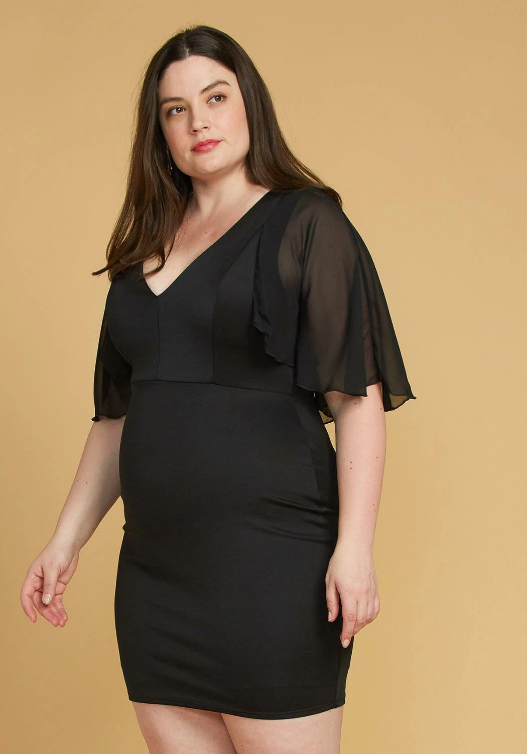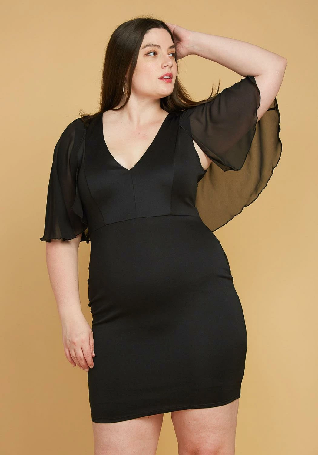 Effortless mini dress for plus size women in chiffon flare short sleeves, v-neck style and bodycon fitting.