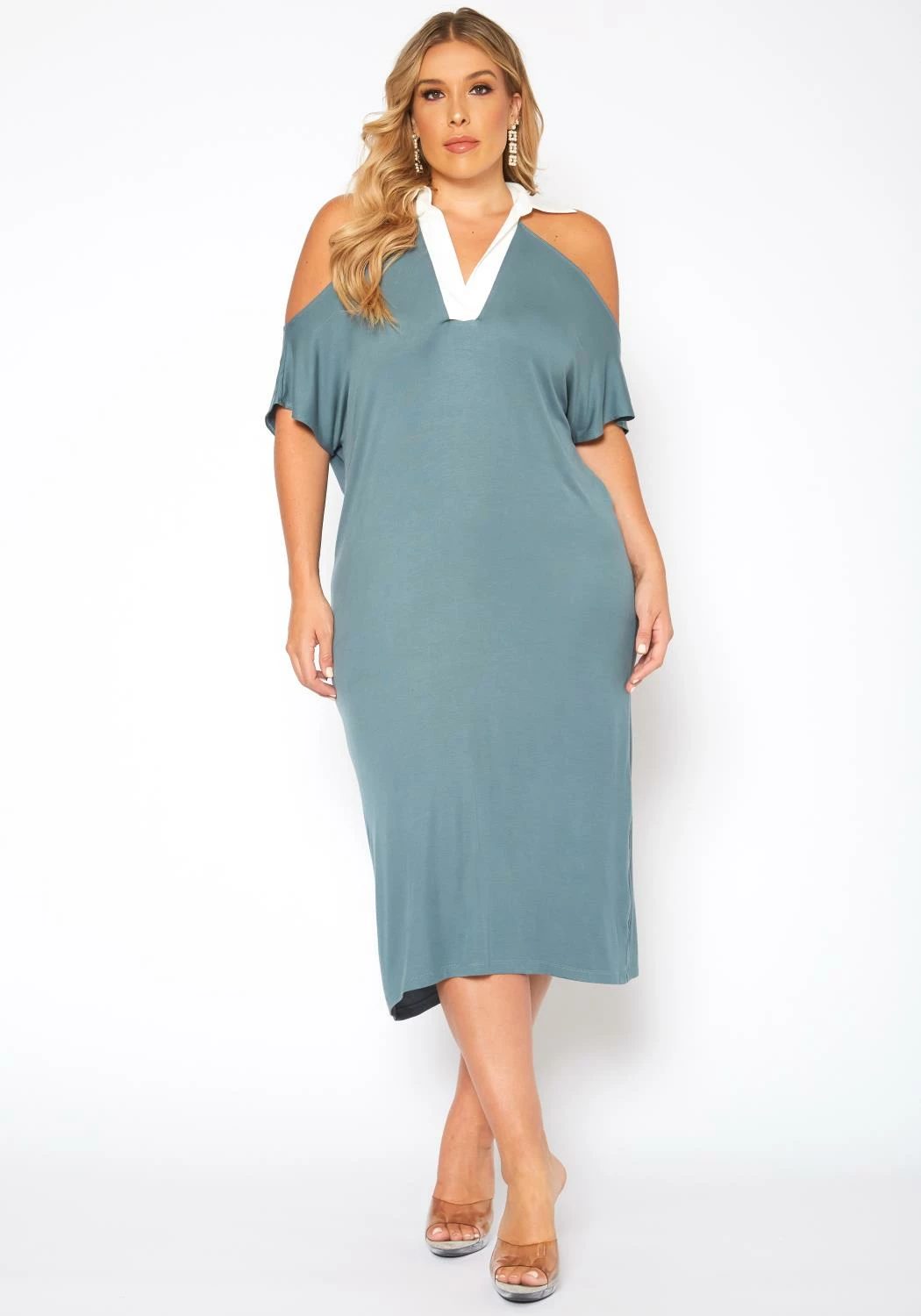 One of a kind plus size women’s chic midi dress in collar neck style, v-neck front, cold shoulder hem, short sleeves, pocket ascent and flare design.