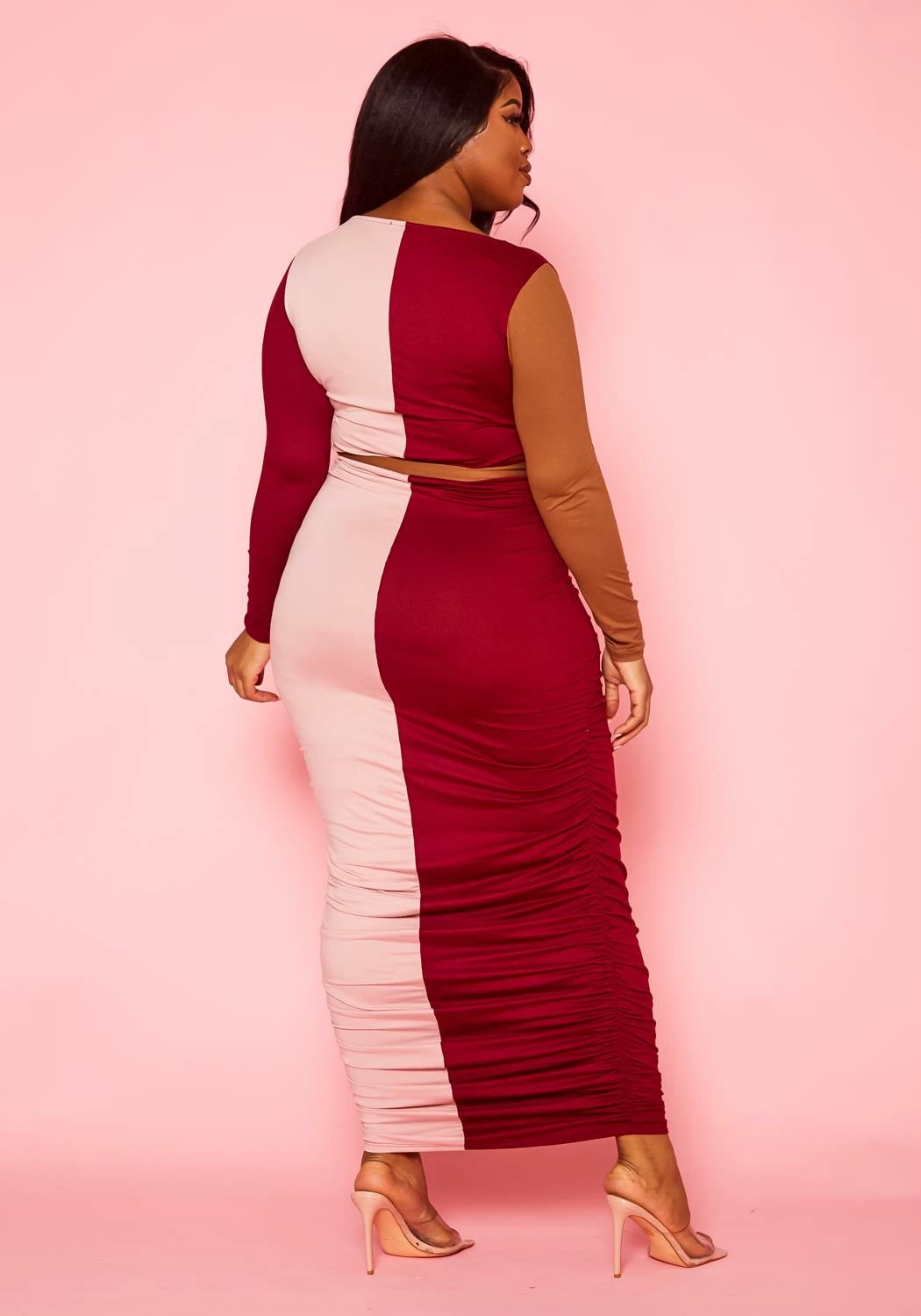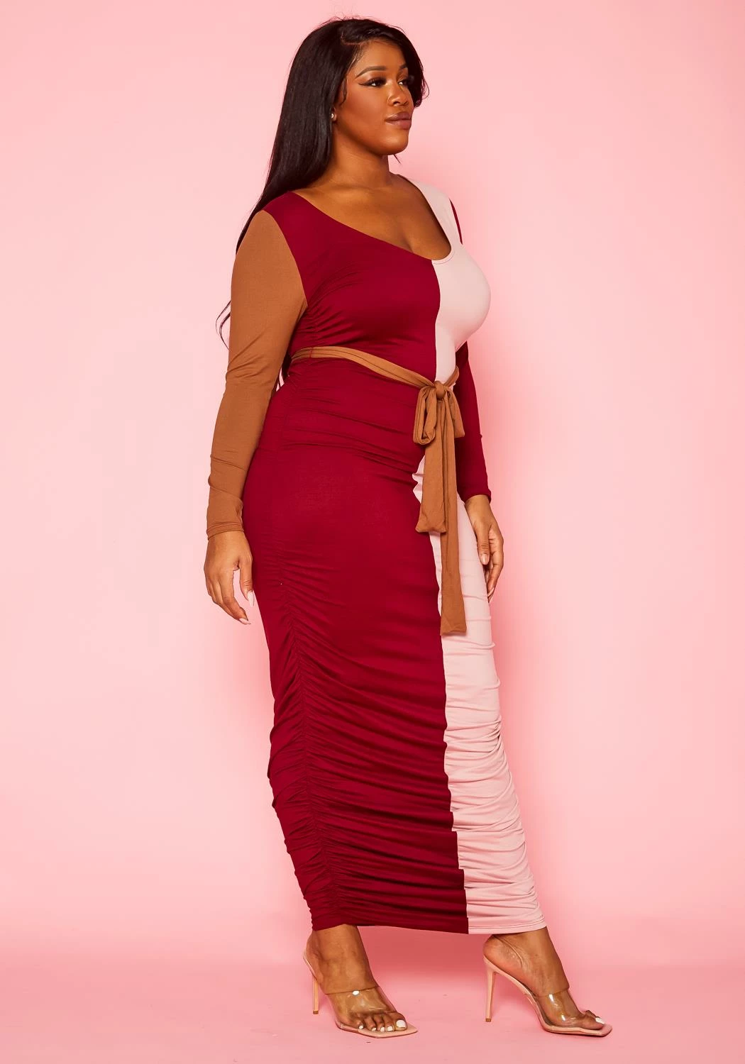 Flattering plus size women’s bodycon maxi dress in trendy color block design, v-neckline, fitted long sleeves, ruched details and waist tie ascent.