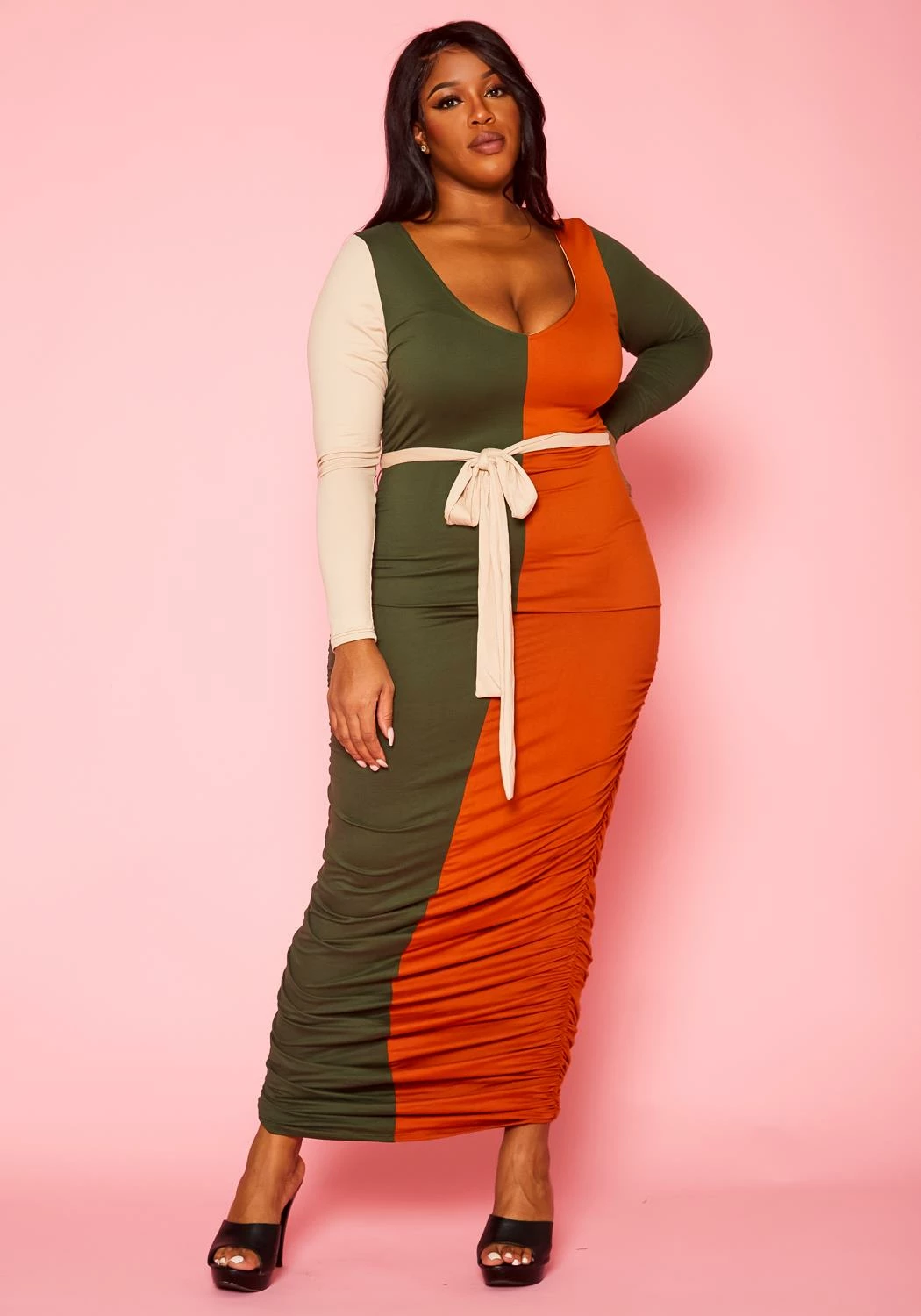 Flattering plus size women’s bodycon maxi dress in trendy color block design, v-neckline, fitted long sleeves, ruched details and waist tie ascent.