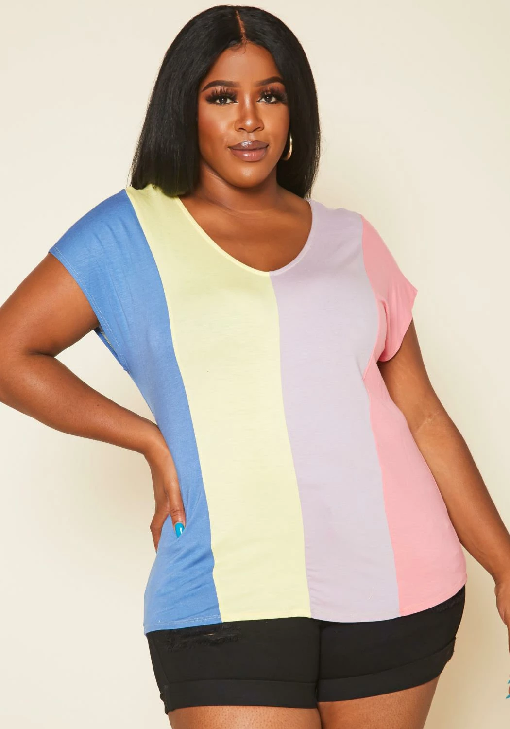 This shirt is perfect for my body type. The V-neck is very flattering, and the color block design is stylish. It’s also very comfortable to wear.