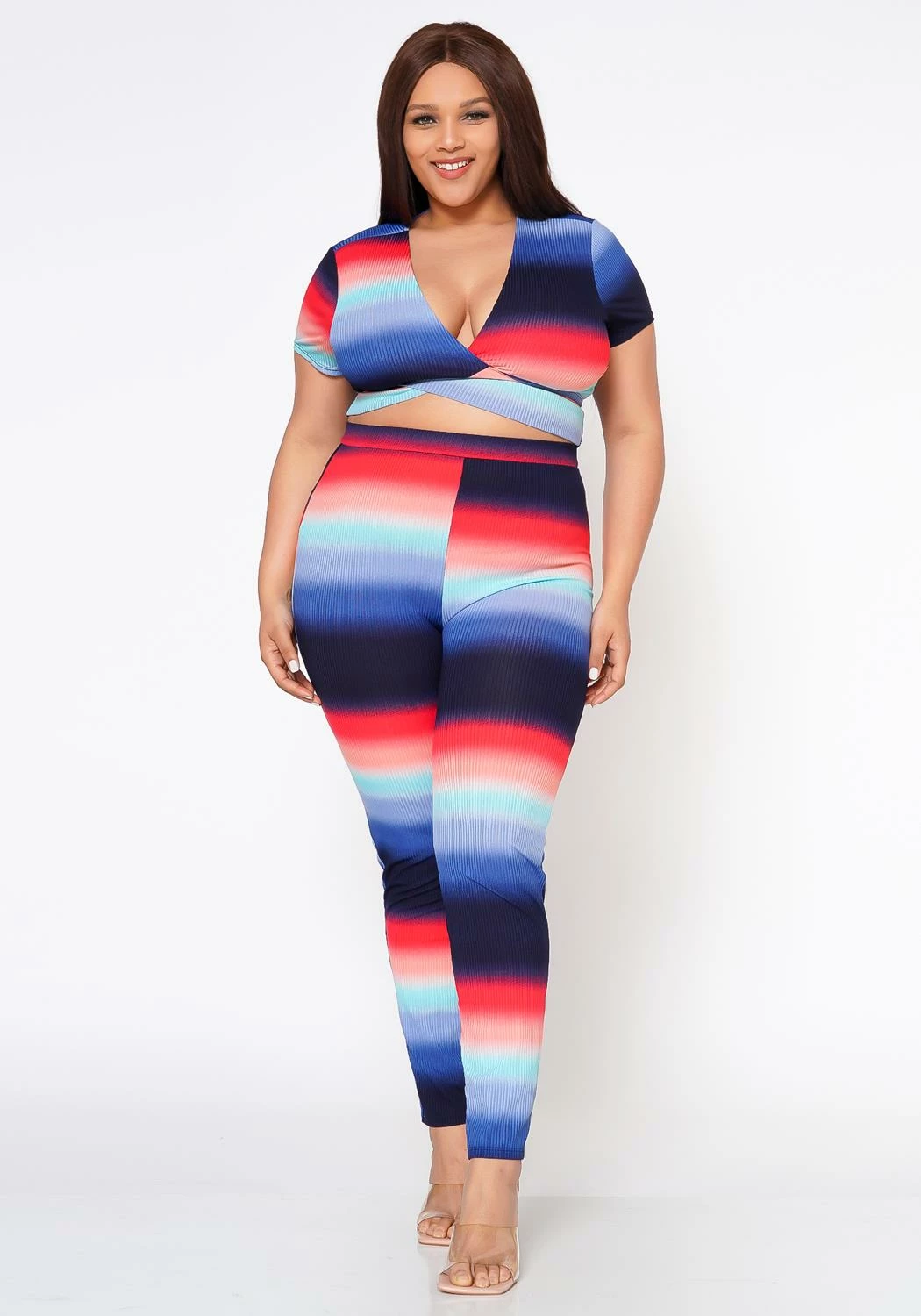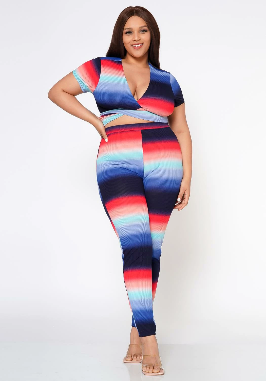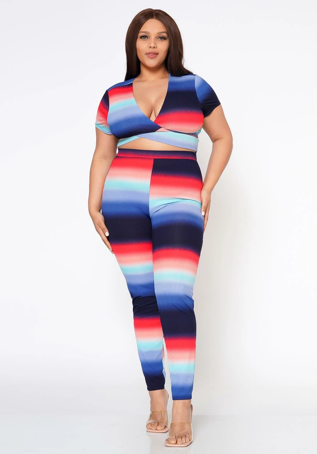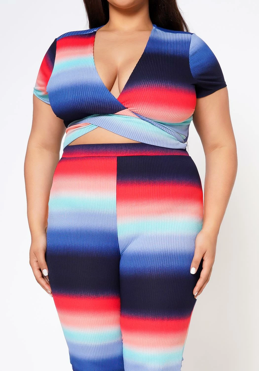 Stunning plus size women’s color gradient matching set. Features a v-neck, short sleeve, self tie wrap crop top and matching high waist leggings.