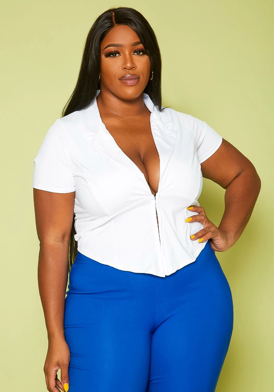 Plus size women’s top in a corset look style, featuring a collar neck, deep v-neck hem, short sleeves and front hook closure.