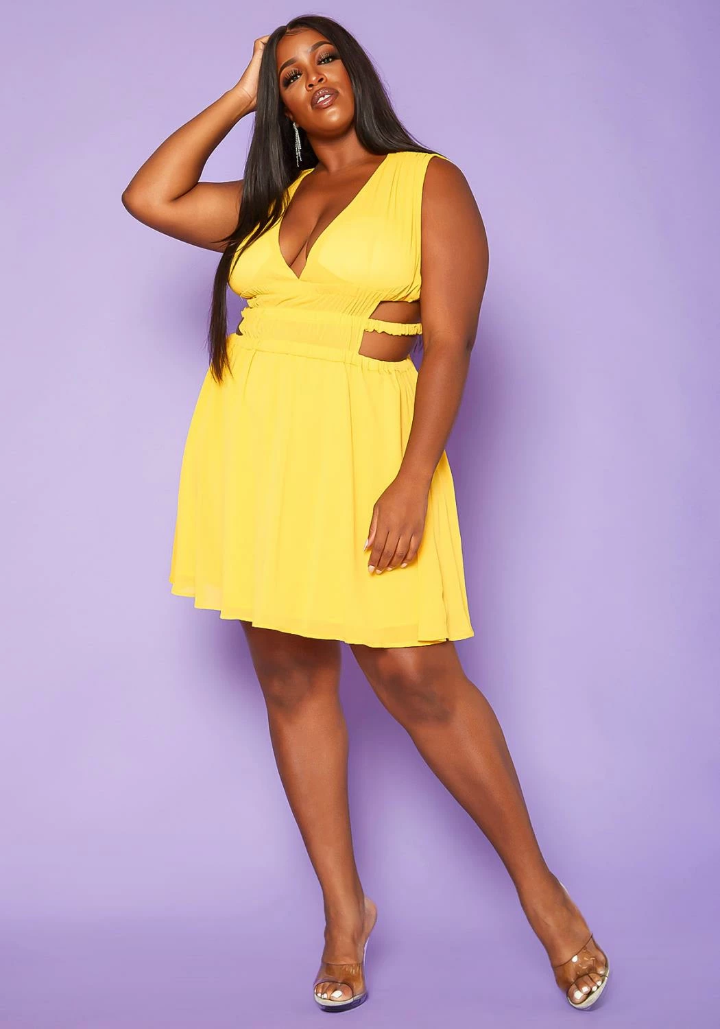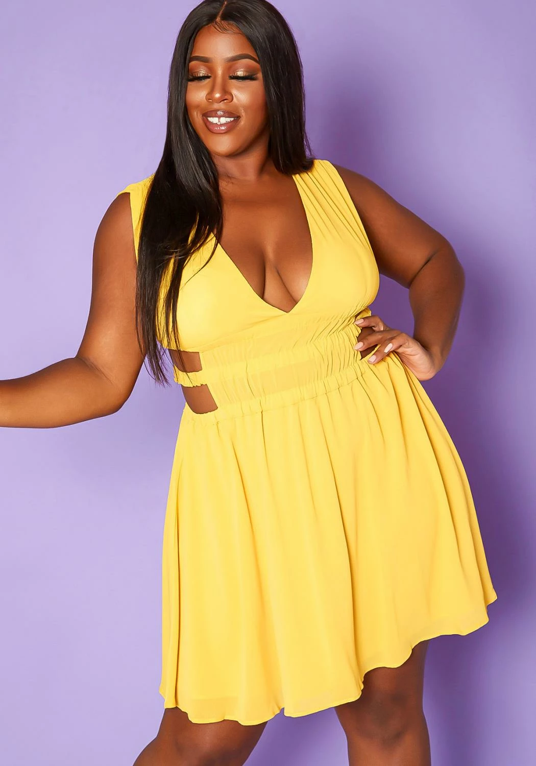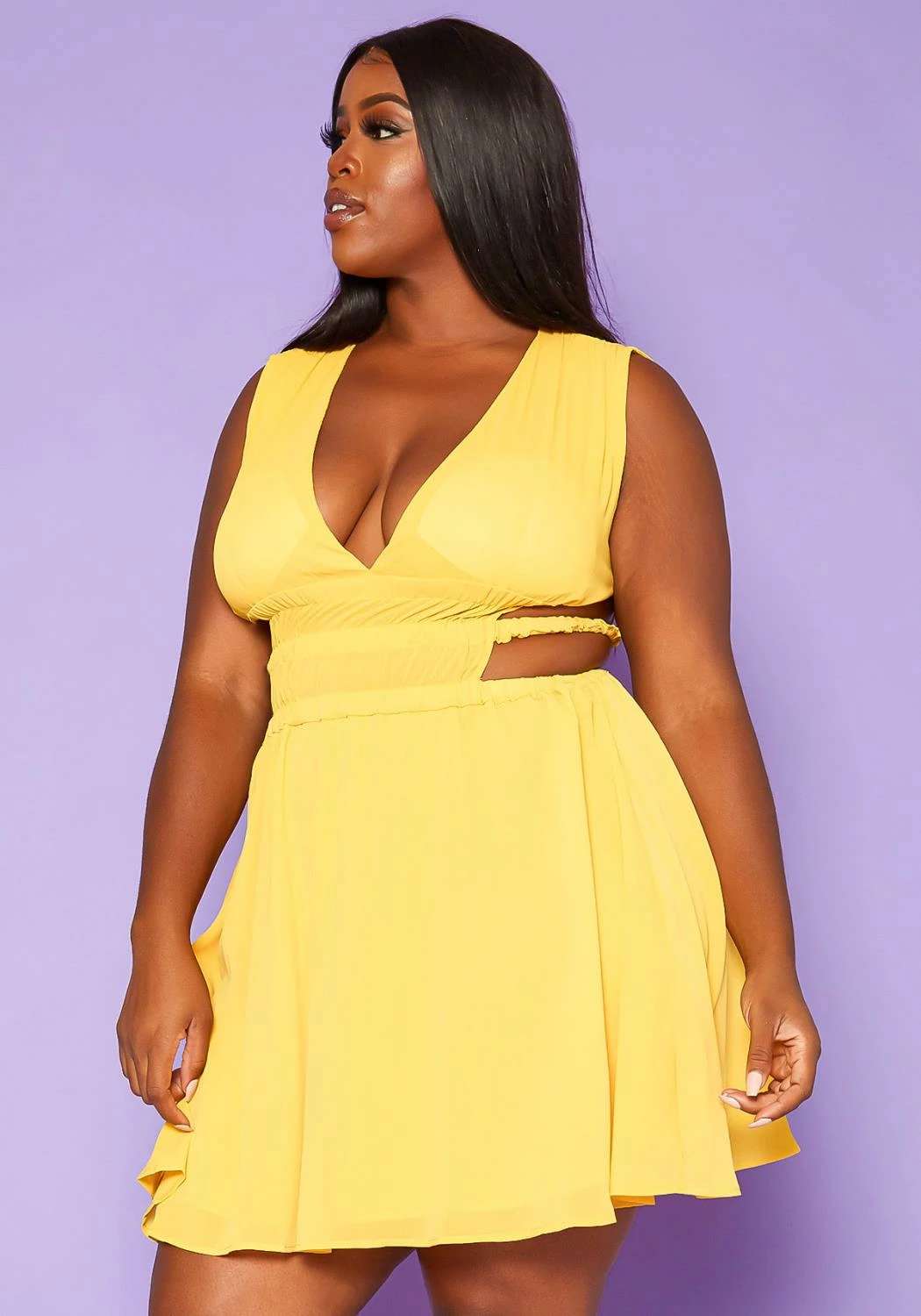 Fresh new style for plus size women! Features a v-neck style, sleeveless look, waist cut-out hem and flare design. Contains bottom lining.