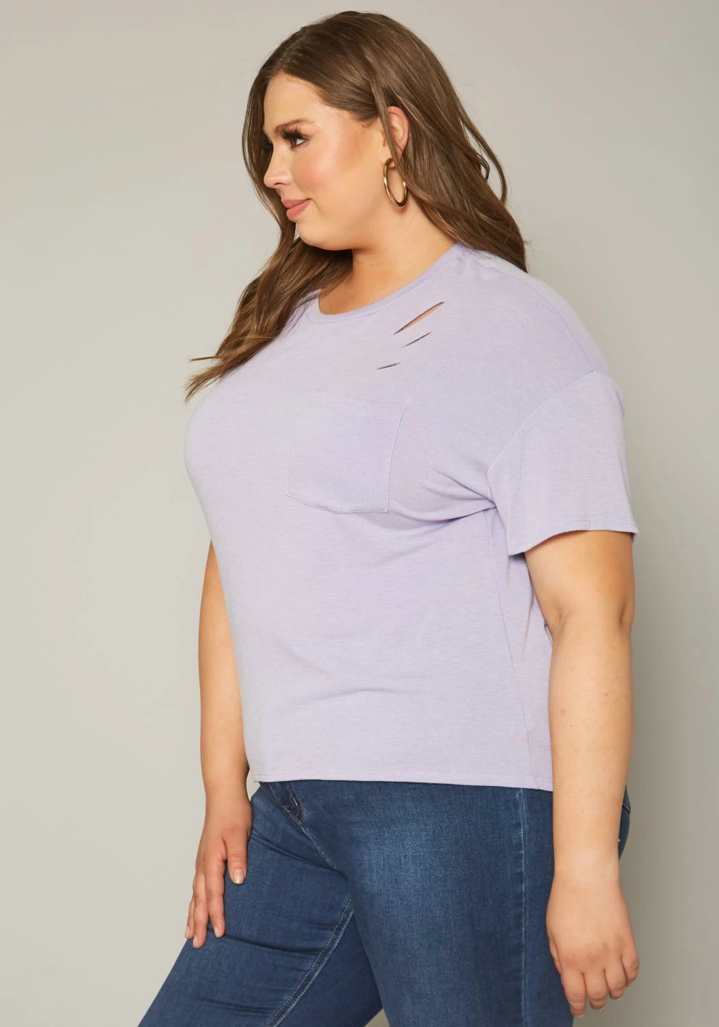 Must have basic t-shirt for plus size in classic crew neck style, short sleeves, pocket ascent and distress details.