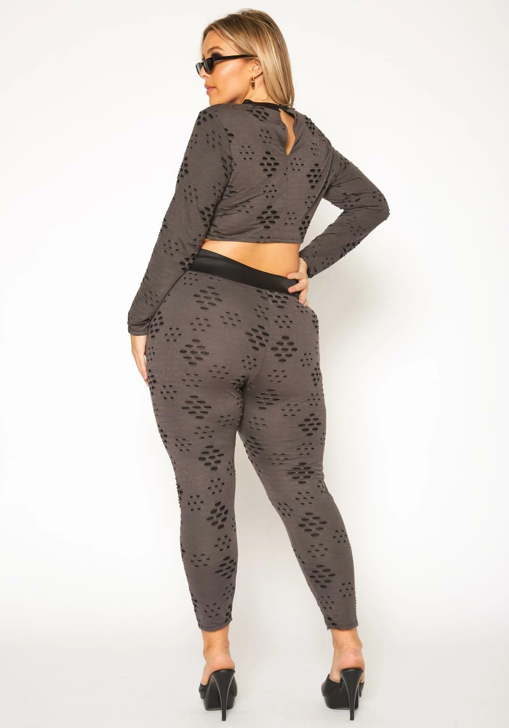 Edgy plus size women’s matching set which features a distressed detail long sleeve crop top and high waist band leggings.