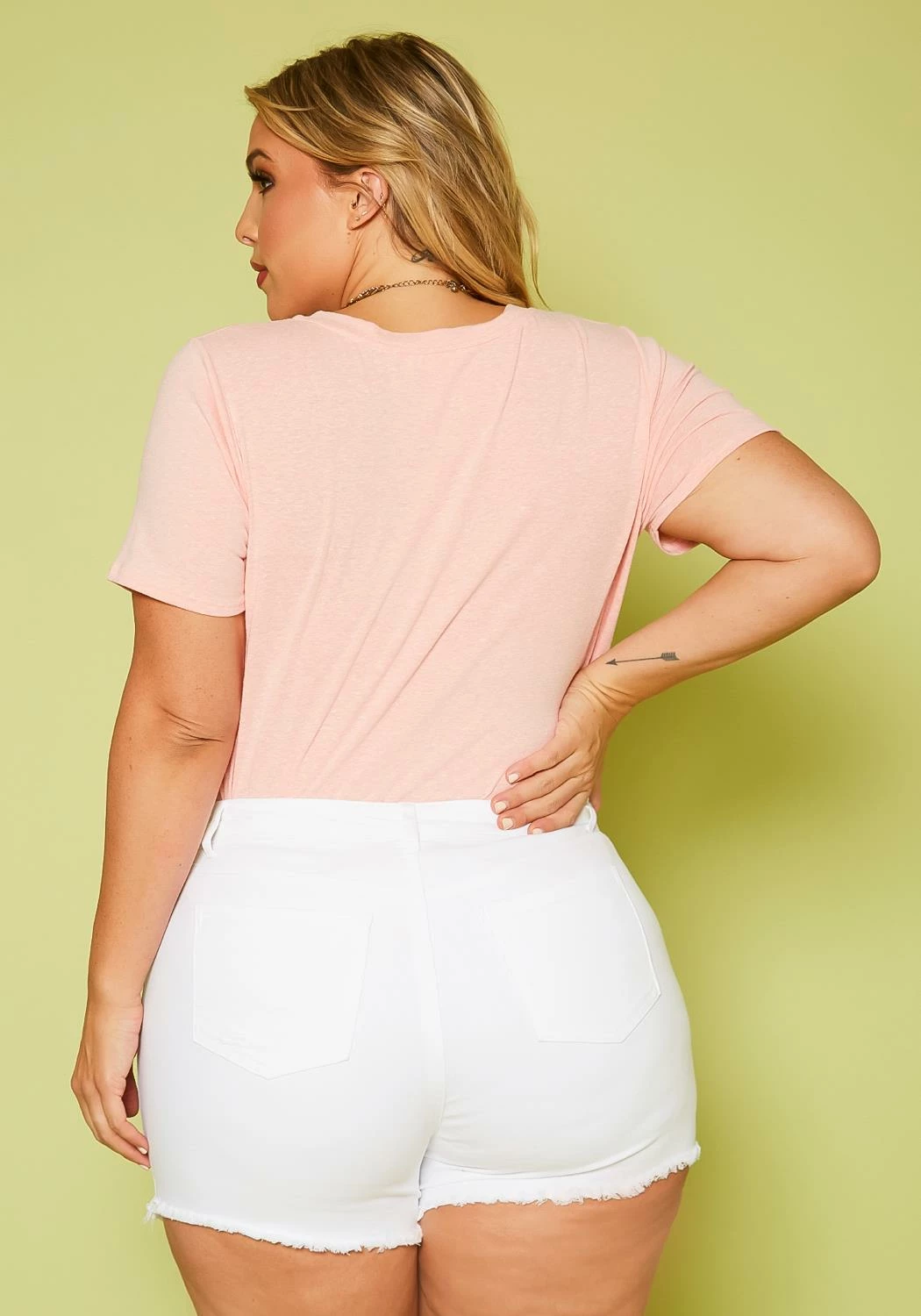 Plus size women’s shorts in denim style, featuring distressed detail, front and back pockets & zipper/button closure.