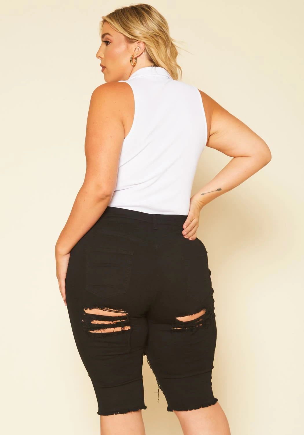 Summer fav biker denim shorts for plus size women which feature a high waist style, distressed front/back hem, belt loop holes and pockets.