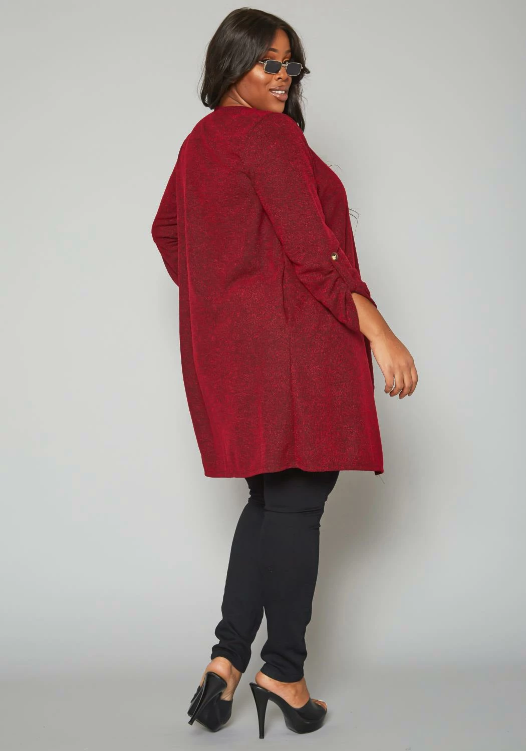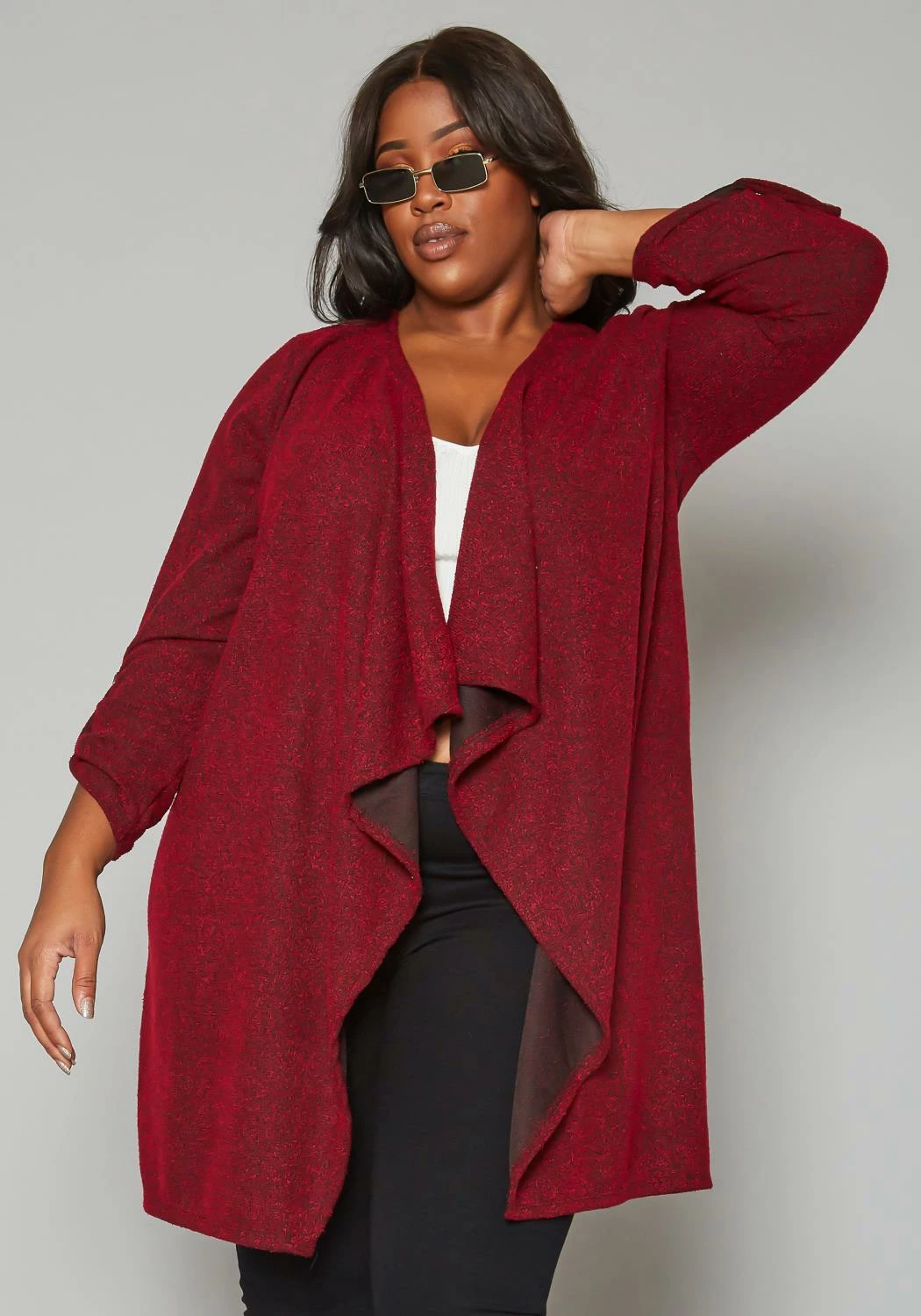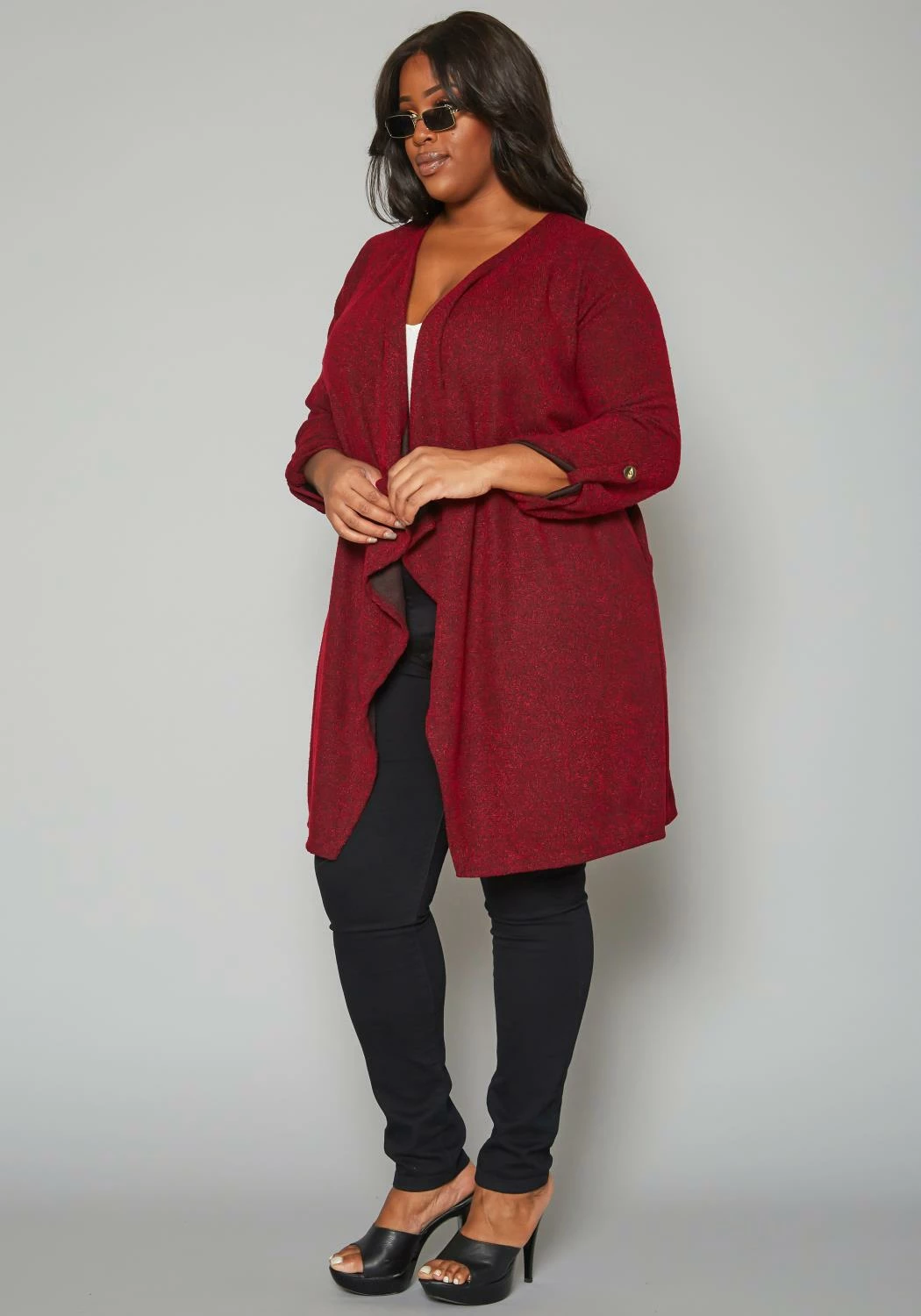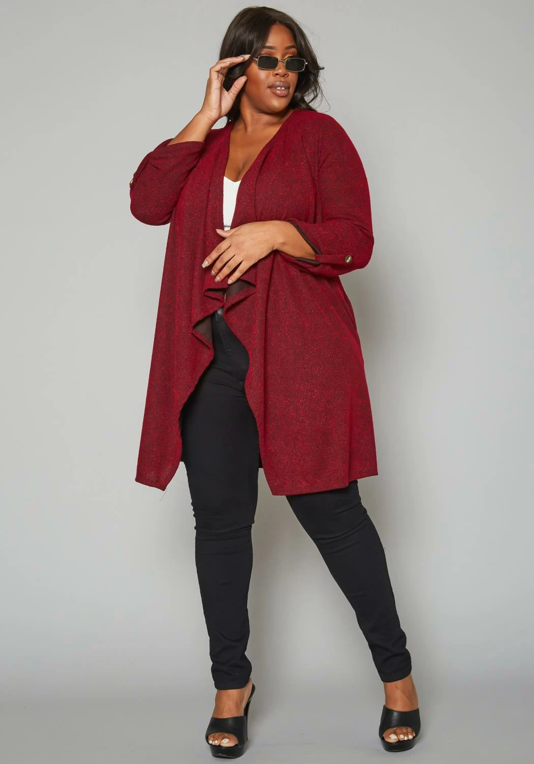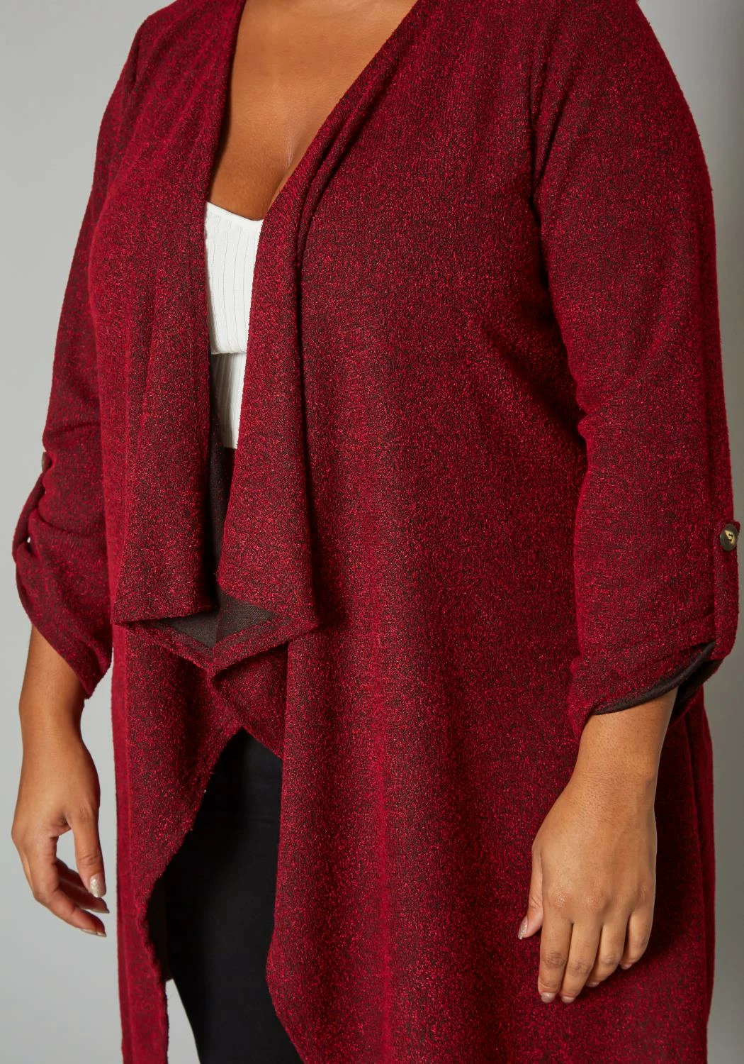 Plus size women’s elegant cardigan in shimmer material, 3/4 long sleeves, roll hem button detail and waterfall drape front design.
