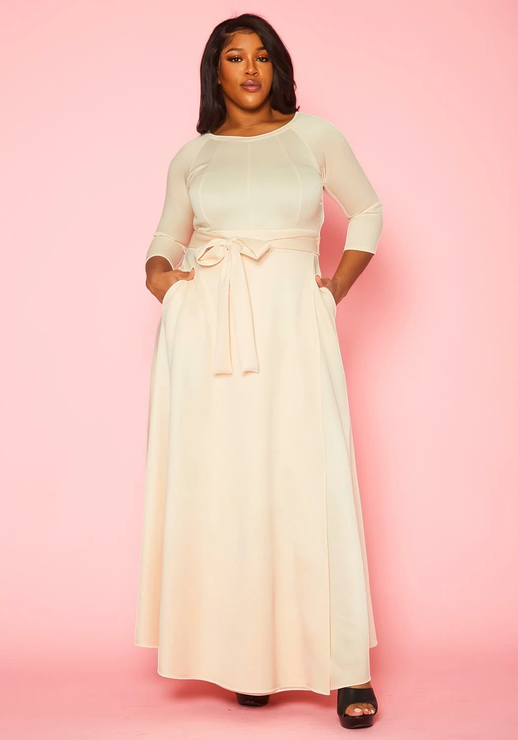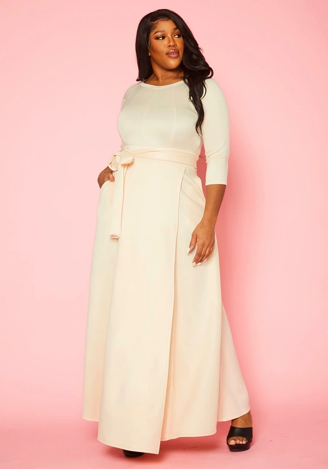 Gorgeous plus size women’s solid color maxi dress. Features fit to flare style, 3/4 fitted long sleeves, round neckline, waist tie ascent and pocket hem.