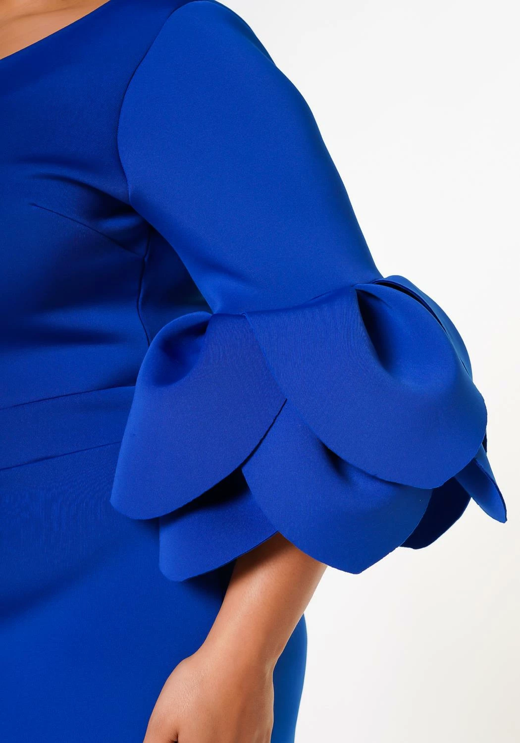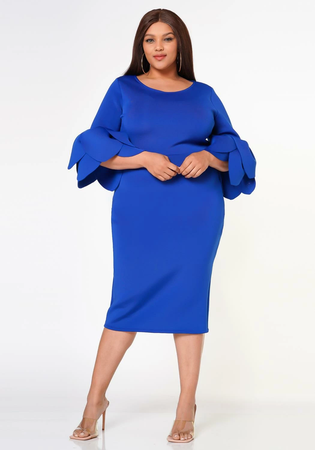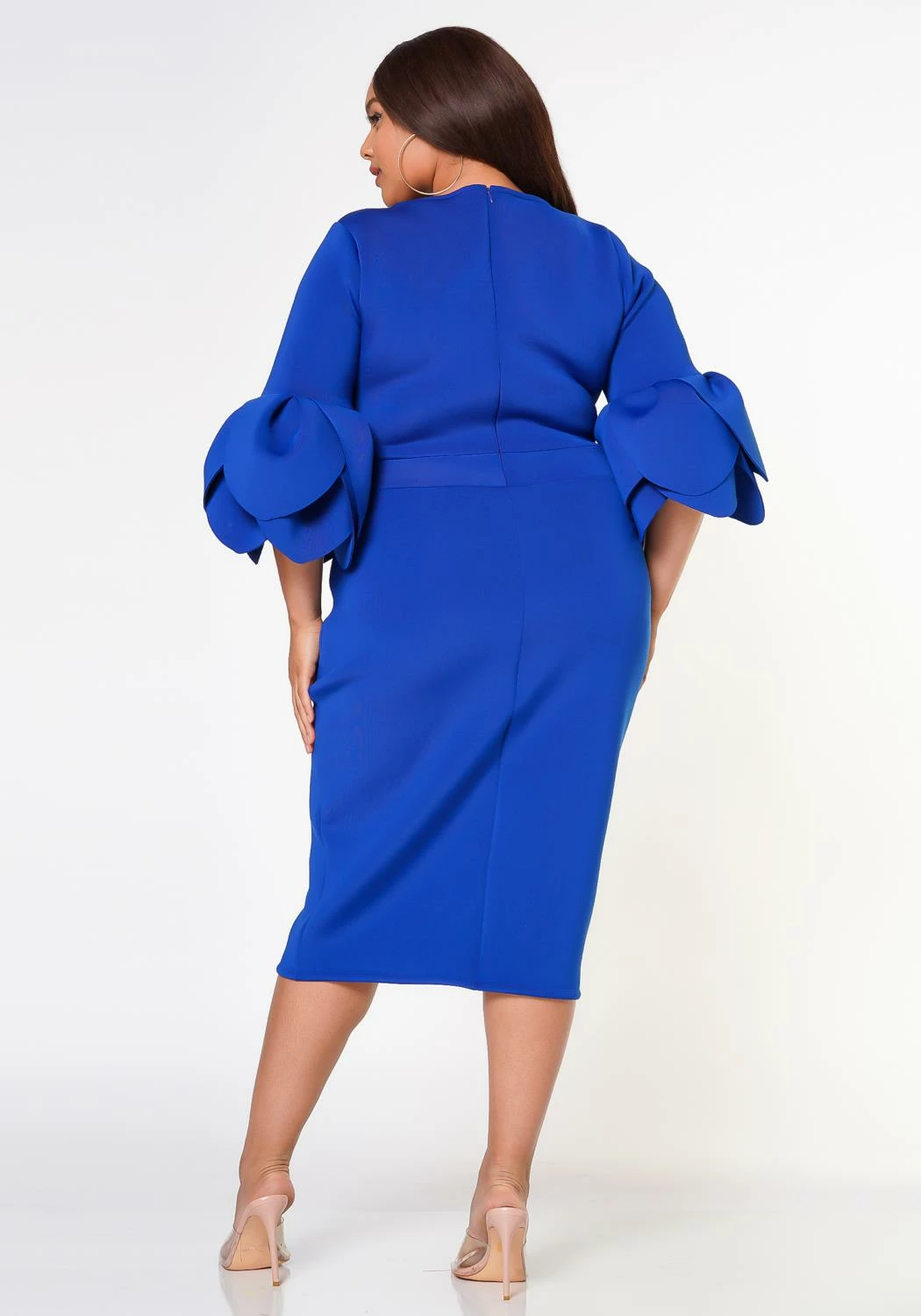 Plus size elegant midi dress made with quality scuba material, petal edged flare sleeves and fitted design. Contains a back zipper closure.