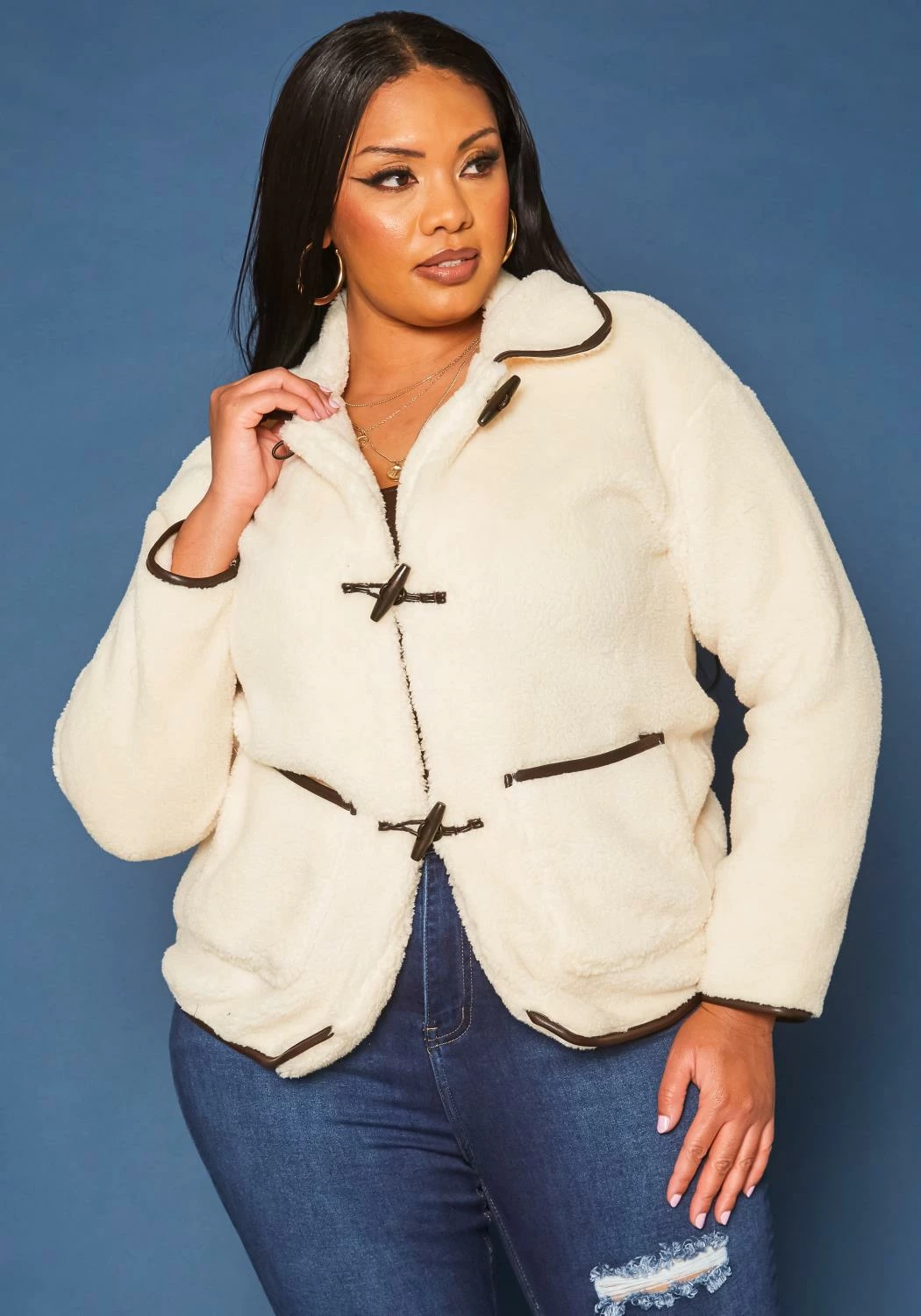 Vintage plus size women’s faux fur coat in collar neck style, pocket hem and toggle duffle button closure.