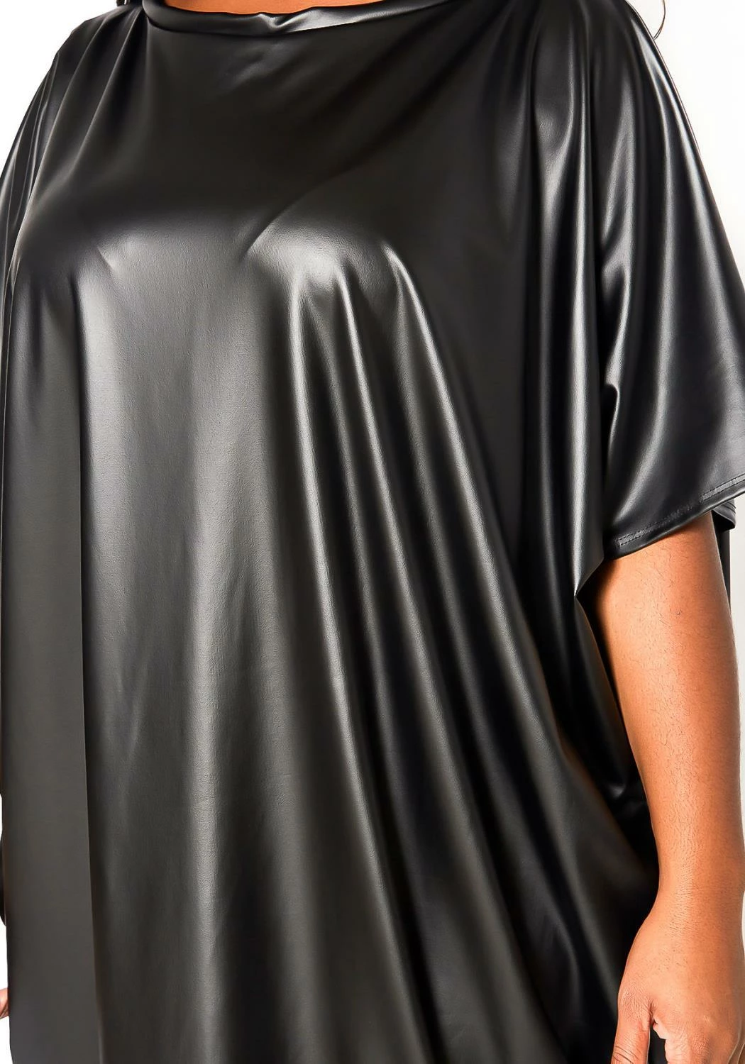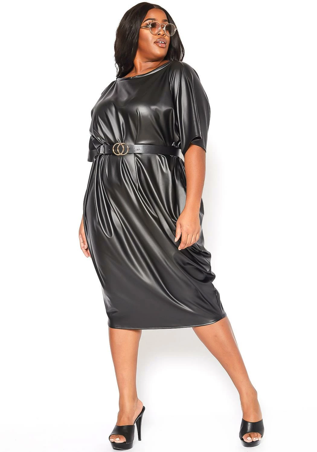 Asoph’s simple but unique oversized plus size women’s faux leather dress that is much complimented with a bold waist belt accessory.