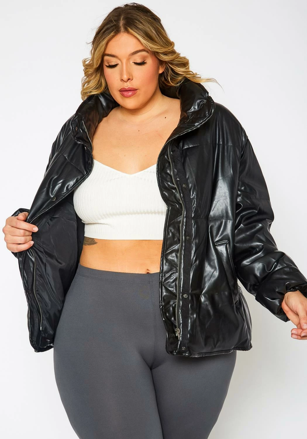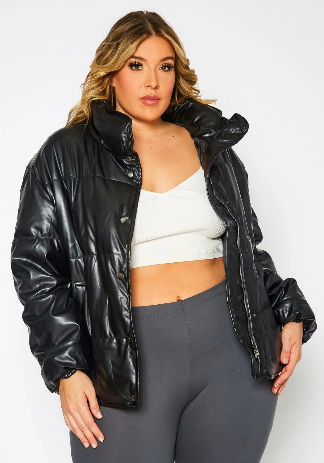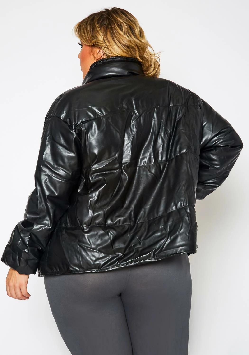 Trendy plus size women’s puffer jacket in faux leather material, front zipper closure, front snap button closure, pocket hem and wrist cuff hem.