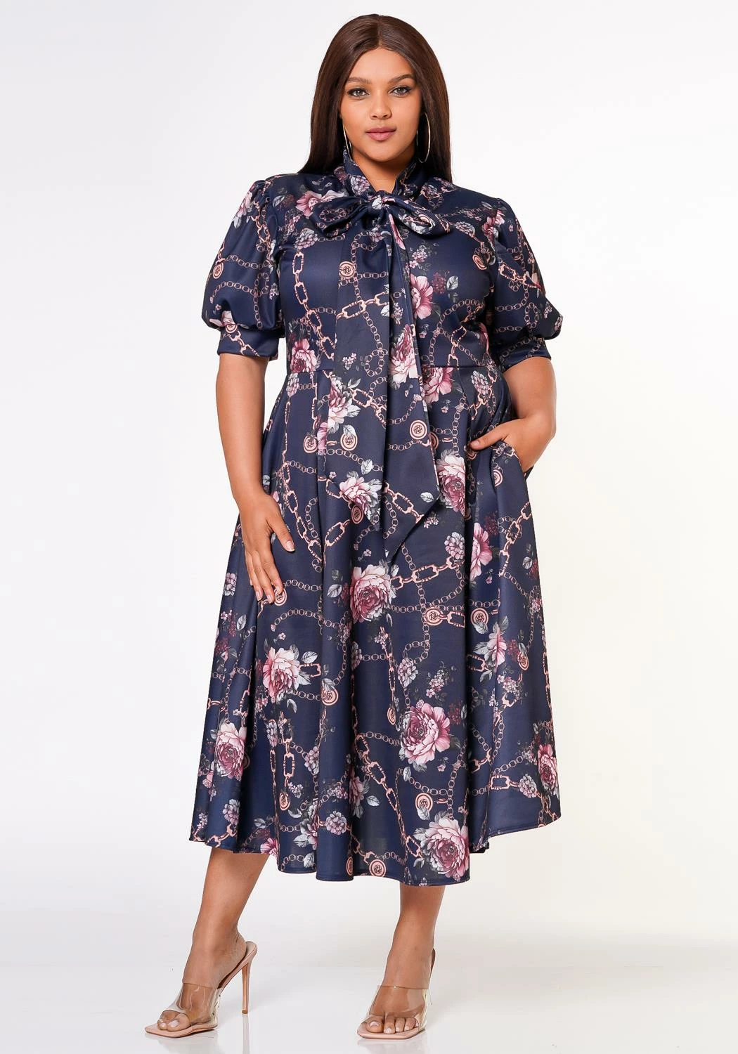 Pretty plus size women’s floral chainlink midi dress in fit to flare design, collar bow tie ascent, short puff sleeves and pocket hem.