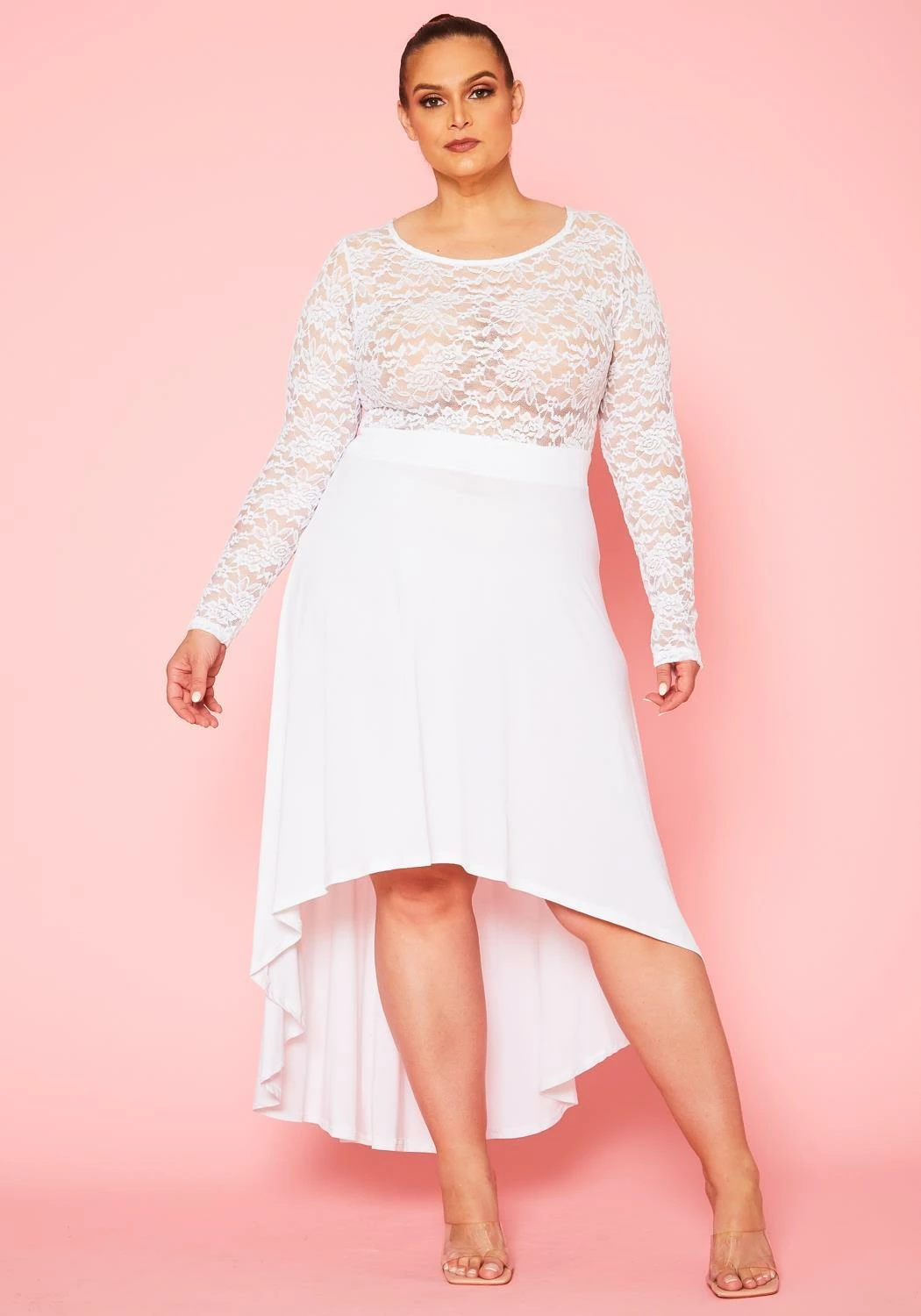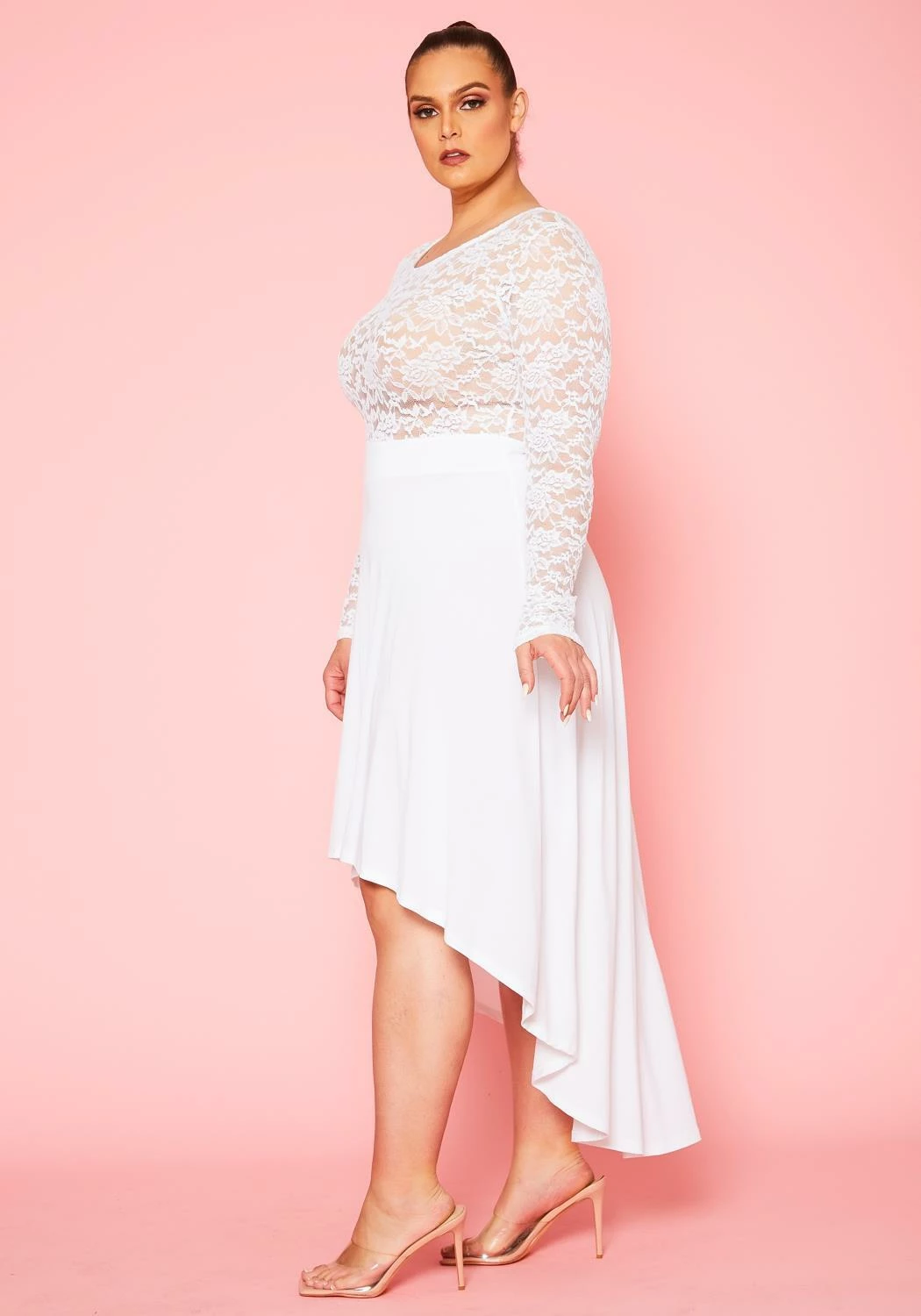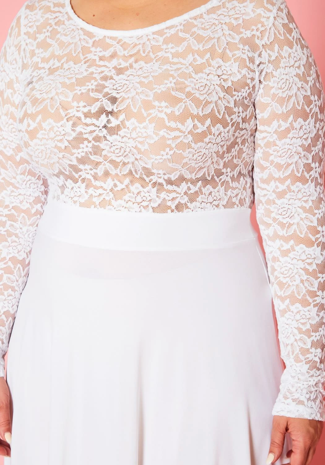 Romantic flare dress for plus size women with floral lace hem, round neckline, fitted long sleeves and high to low flare.