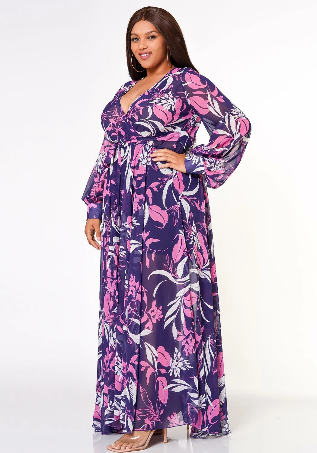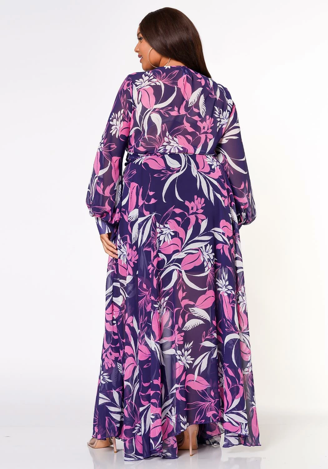 Absolute gorgeous plus size women’s maxi dress in multi pattern, v-neck style, long sleeves, fitted wrist cuffs and waist tie ascent.