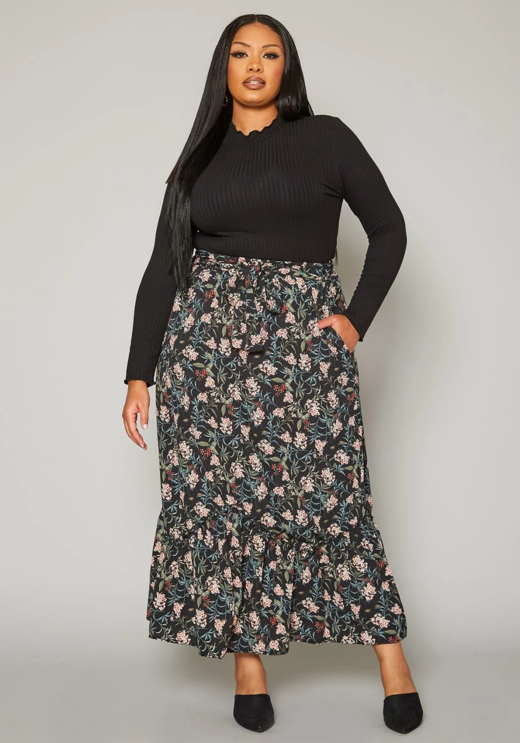 Lovely plus size women’s maxi skirt in floral print, high waist style, waist tie ascent and flare design.