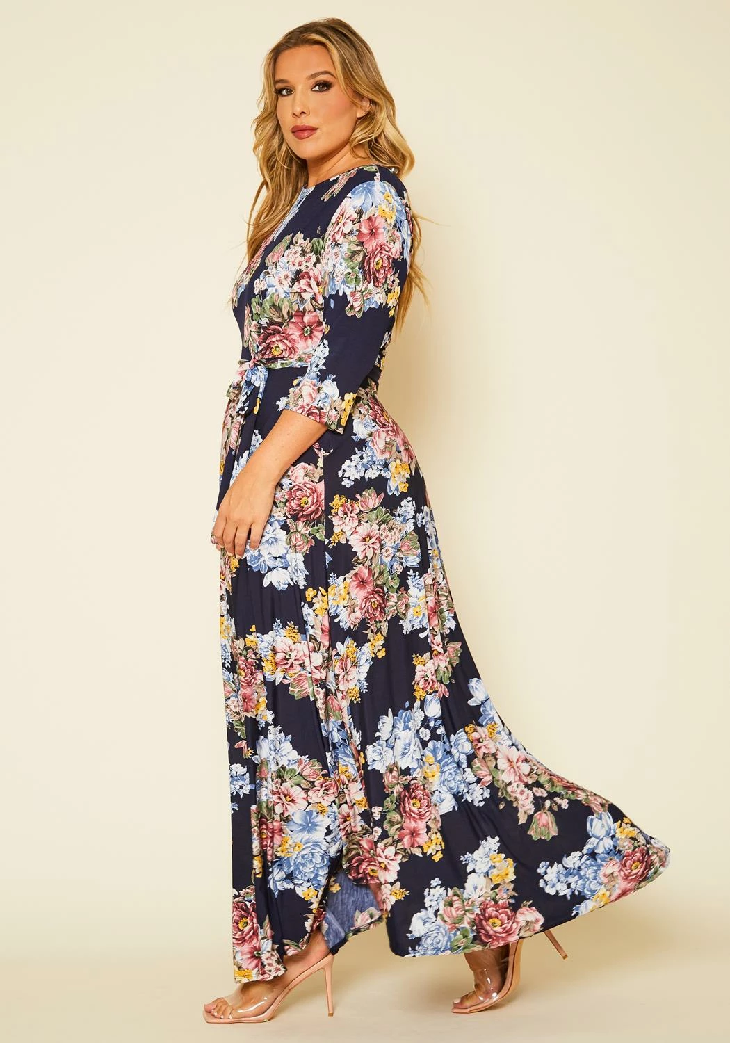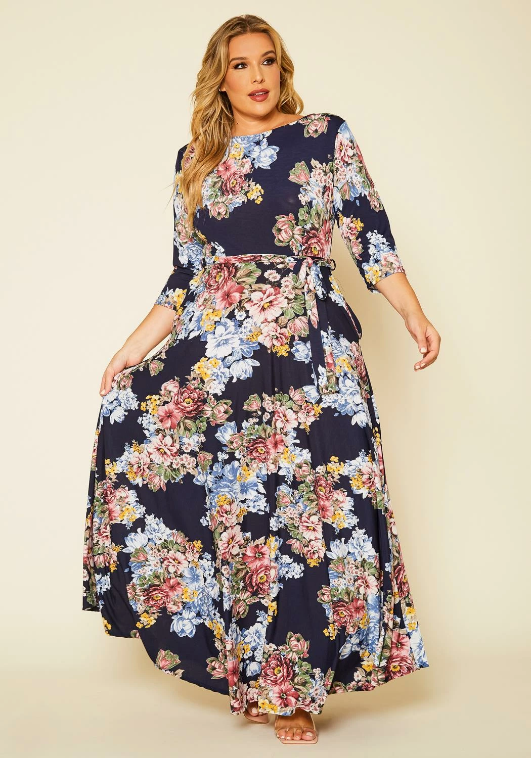 Plus size women’s dress in maxi style, featuring boat neck hem, 3/4 sleeve hem, non-detachable waist tie up detail & side pockets.