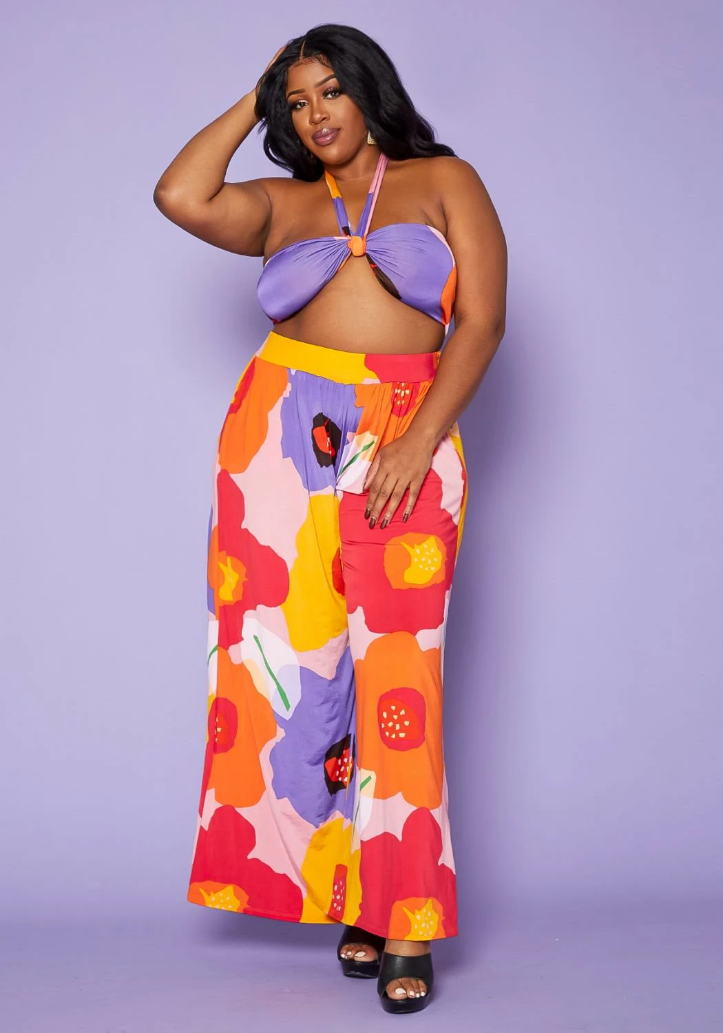 Plus size women’s set in floral print featuring a versatile wrap halter top paired with high waist palazzo pants.