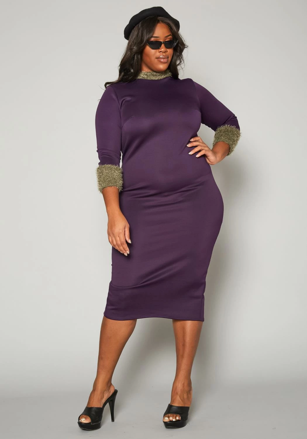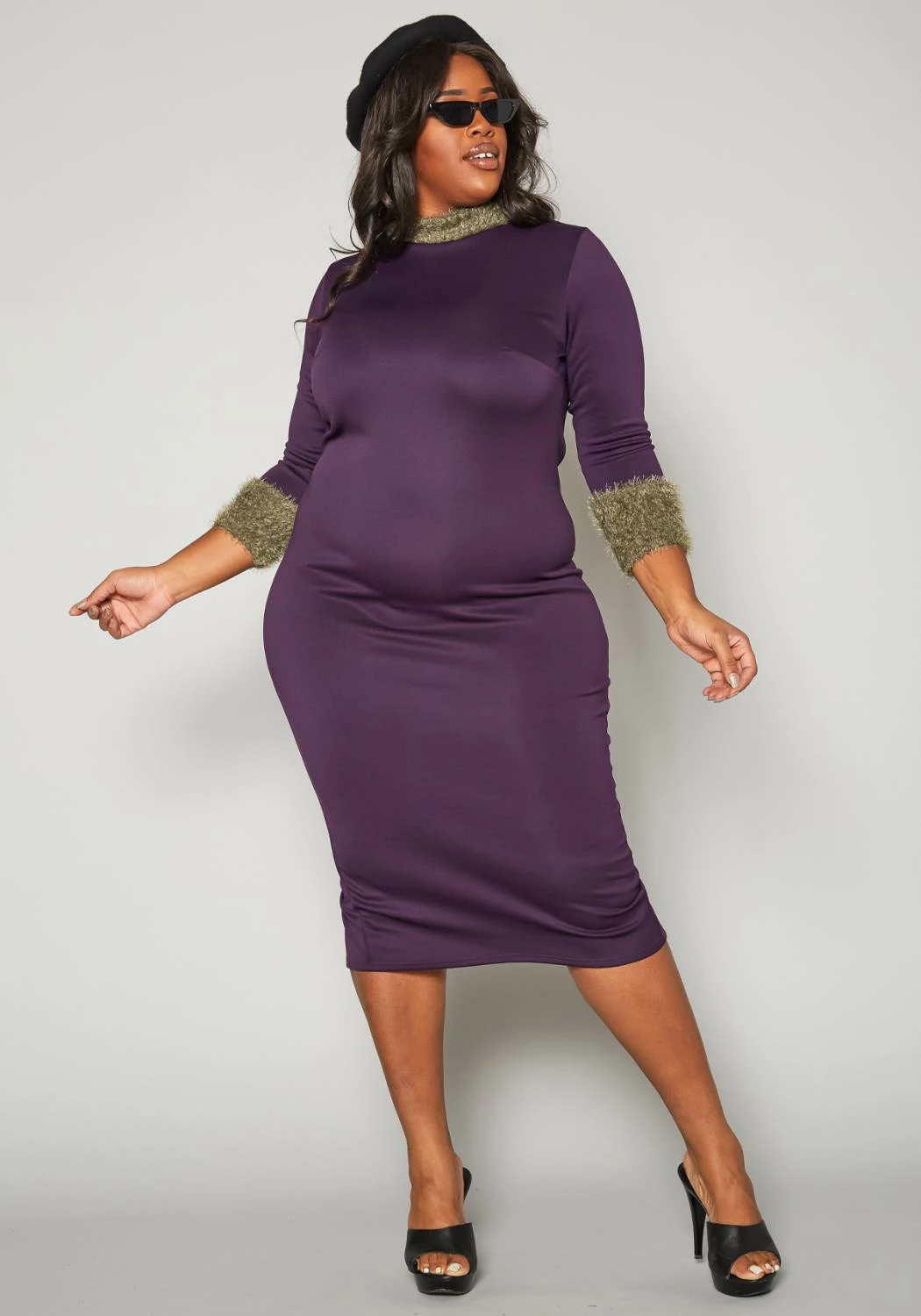 Chic plus size women’s midi dress in bodycon fitting, 3/4 long sleeves, high neck style and color contrast fuzzy knit trim.