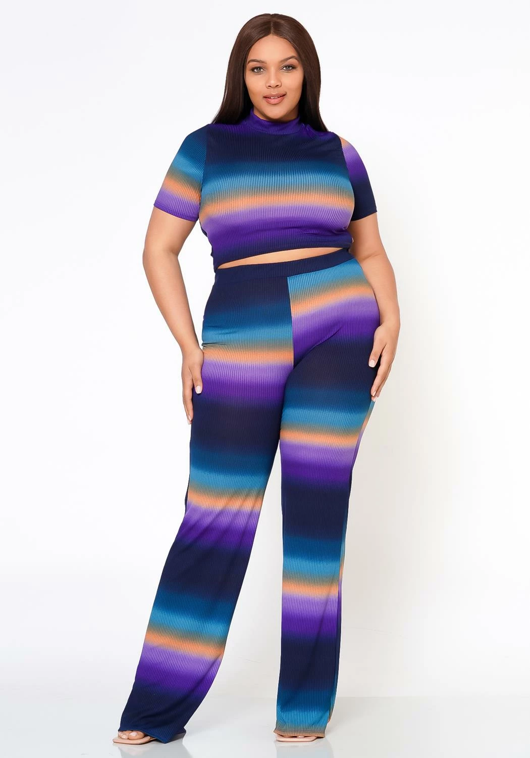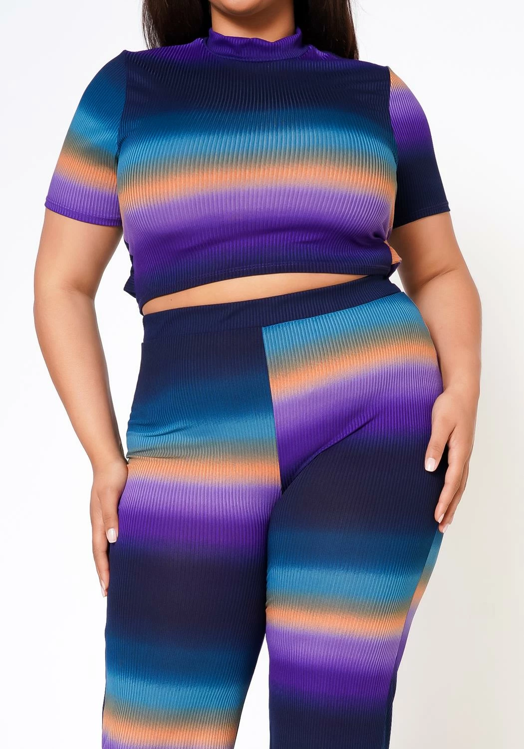This outfit is absolutely fabulous! The gradient colors are unique, and the ribbed pants hug my curves perfectly. I felt both comfortable and stylish wearing it. It’s a must-have for any plus-size fashionista. I can’t wait to wear it again!
