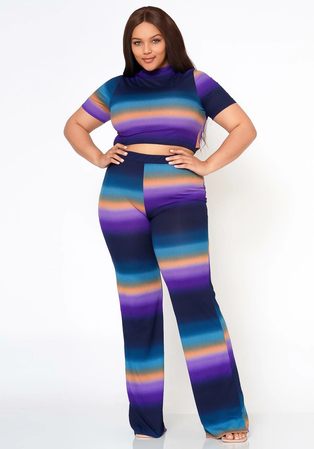 This set is absolutely stunning! The gradient colors are vibrant and eye-catching. The fit is perfect for plus size, and the crop top pairs beautifully with the ribbed pants. Highly recommend!
