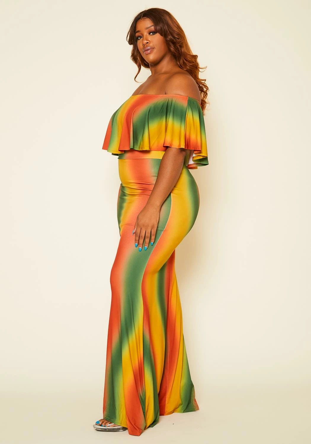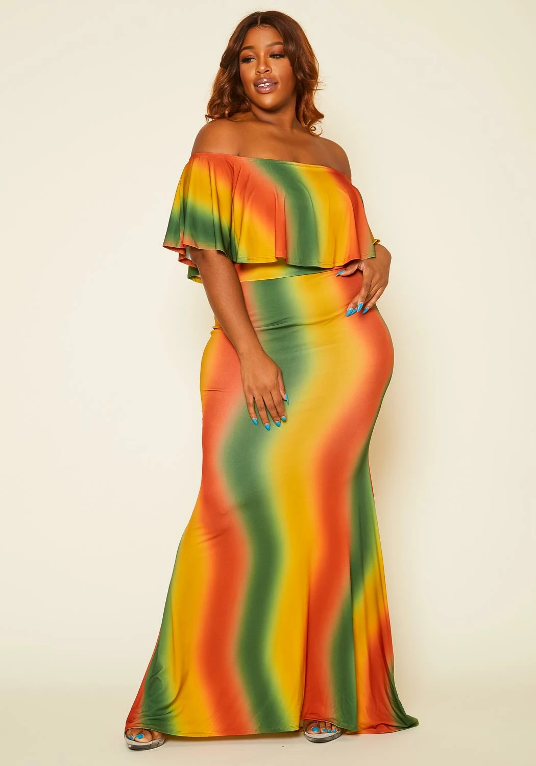 Plus size women’s dress in maxi style, featuring off shoulder hem, bodycon fit, fit & flare style & gradient pattern.