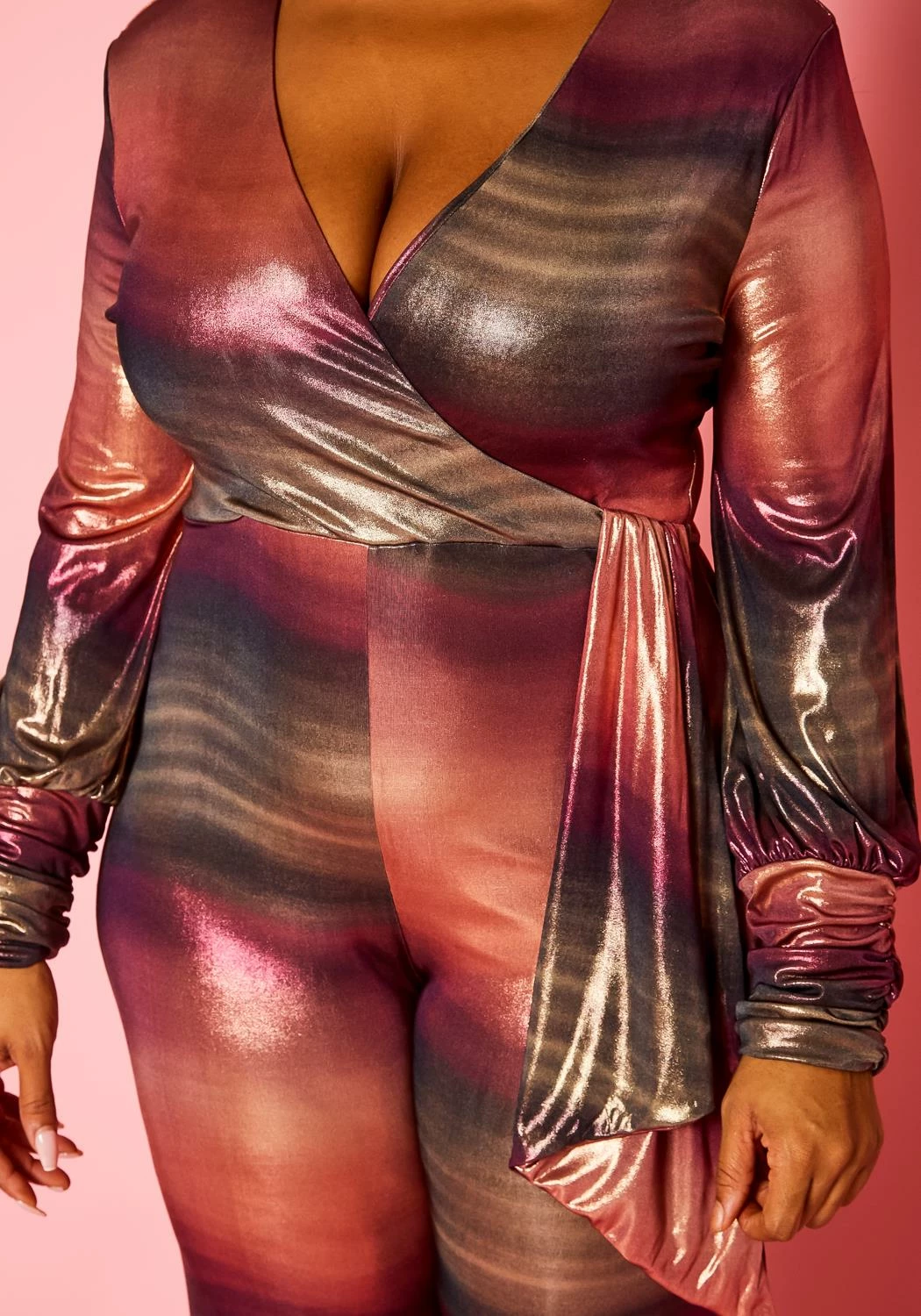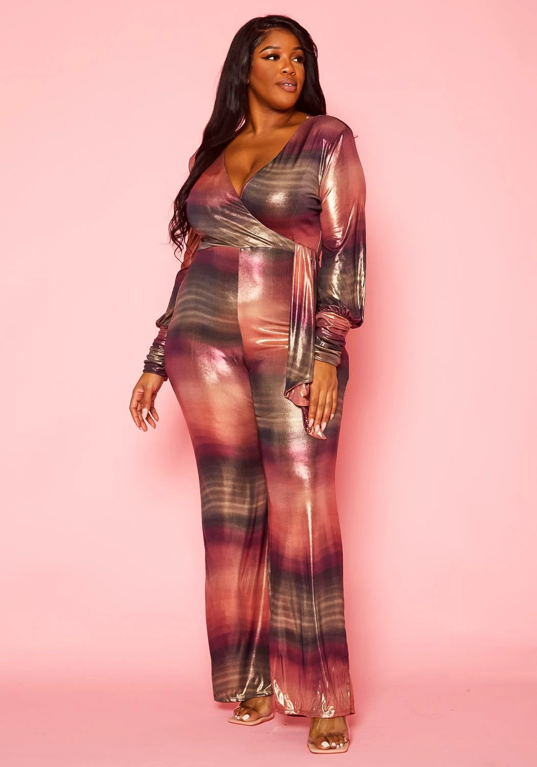 Romantic plus size women’s jumpsuit in gradient color pattern, sheen-metallic material, v-neckline, flare leg hem and long sleeves with fitted wrist cuffs.