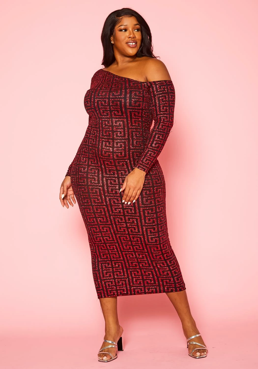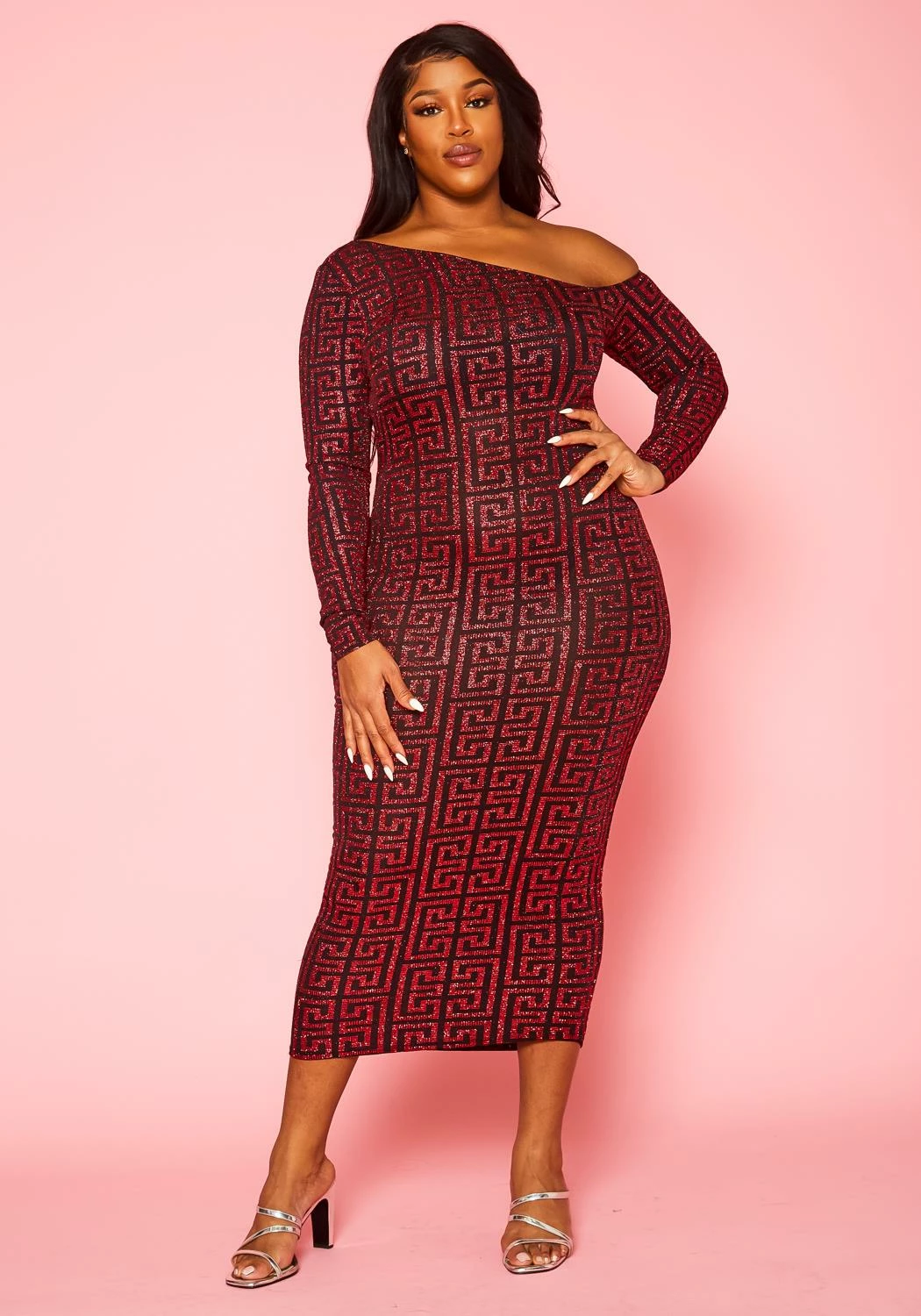 Gorgeous plus size women’s midi dress in sparkly greek key pattern, asymmetric cold shoulder hem, fitted long sleeves and bodycon fit.