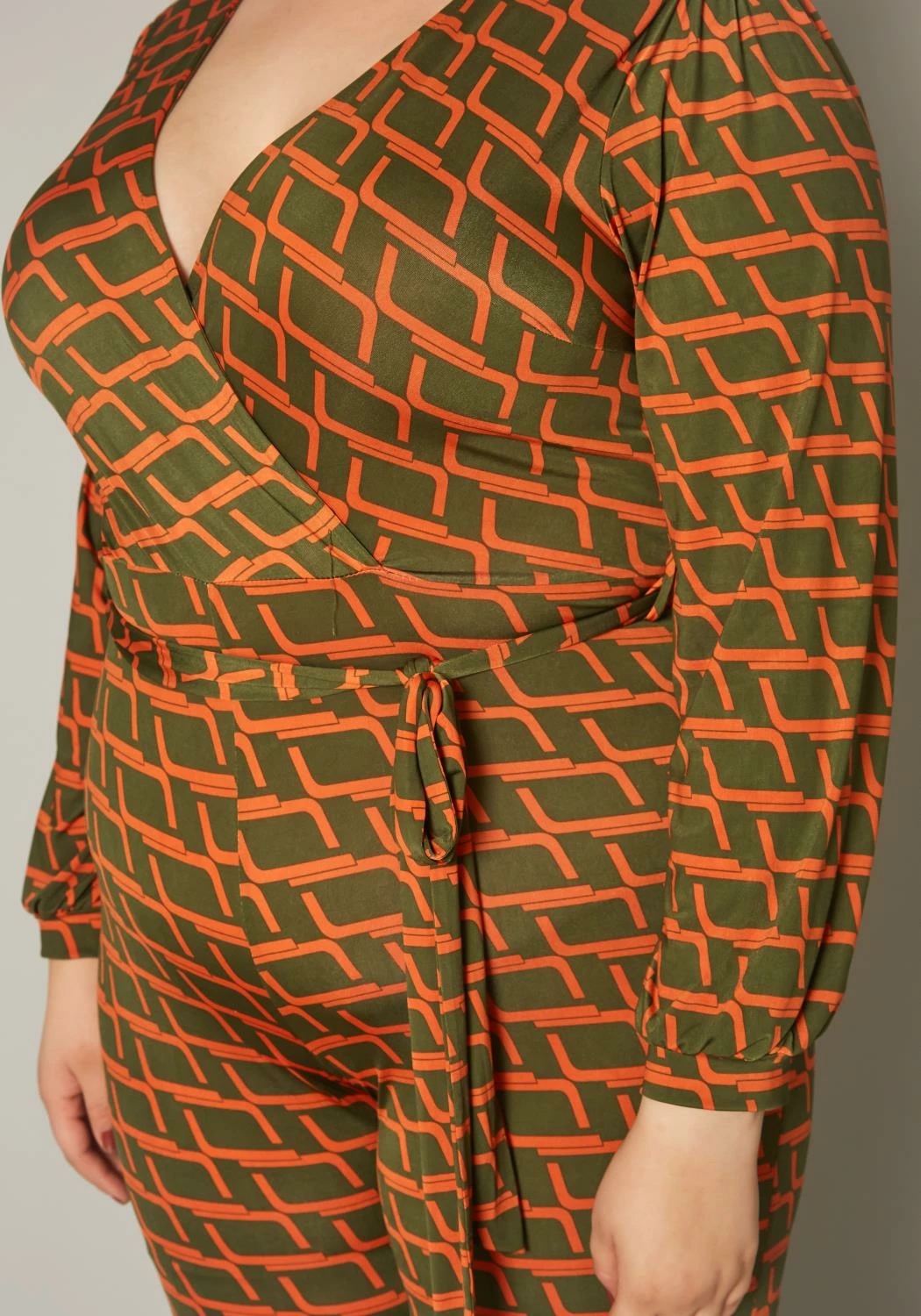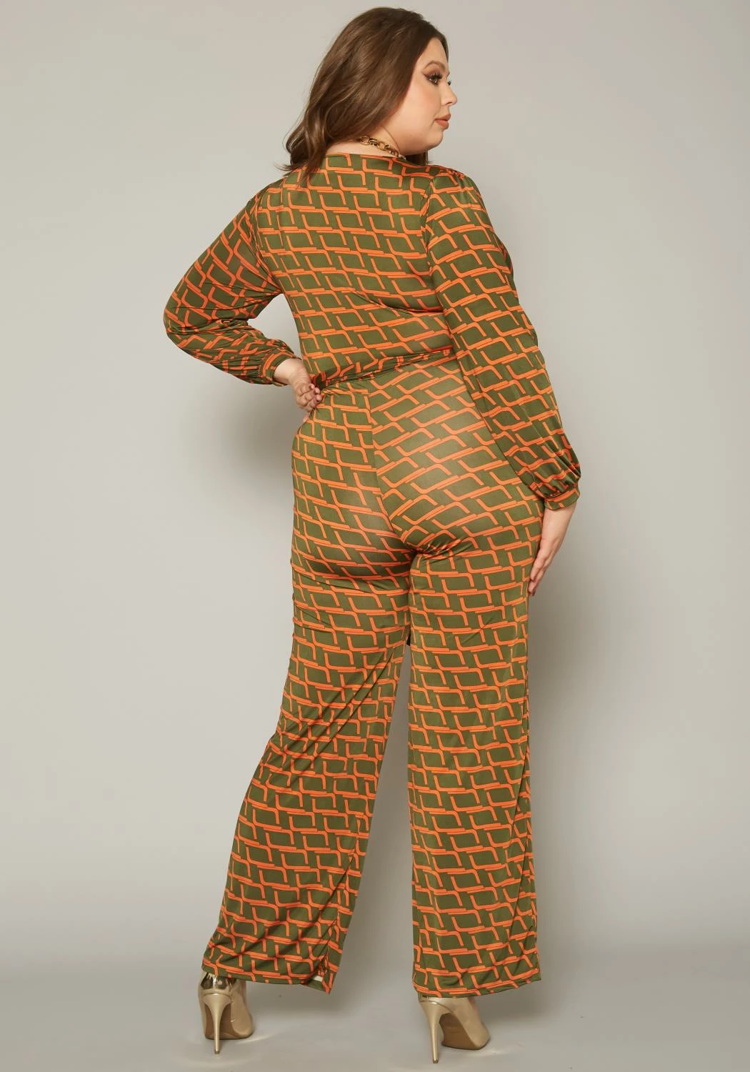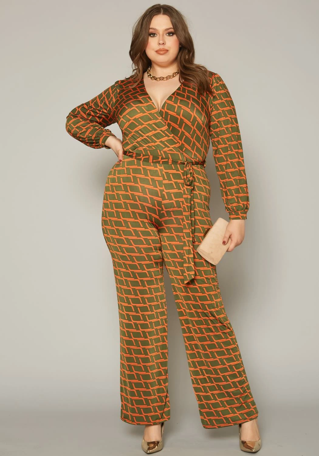 Plus size women’s jumpsuit in grid plaid pattern, v-neck style, long sleeves, waist tie ascent and flare leg hem.