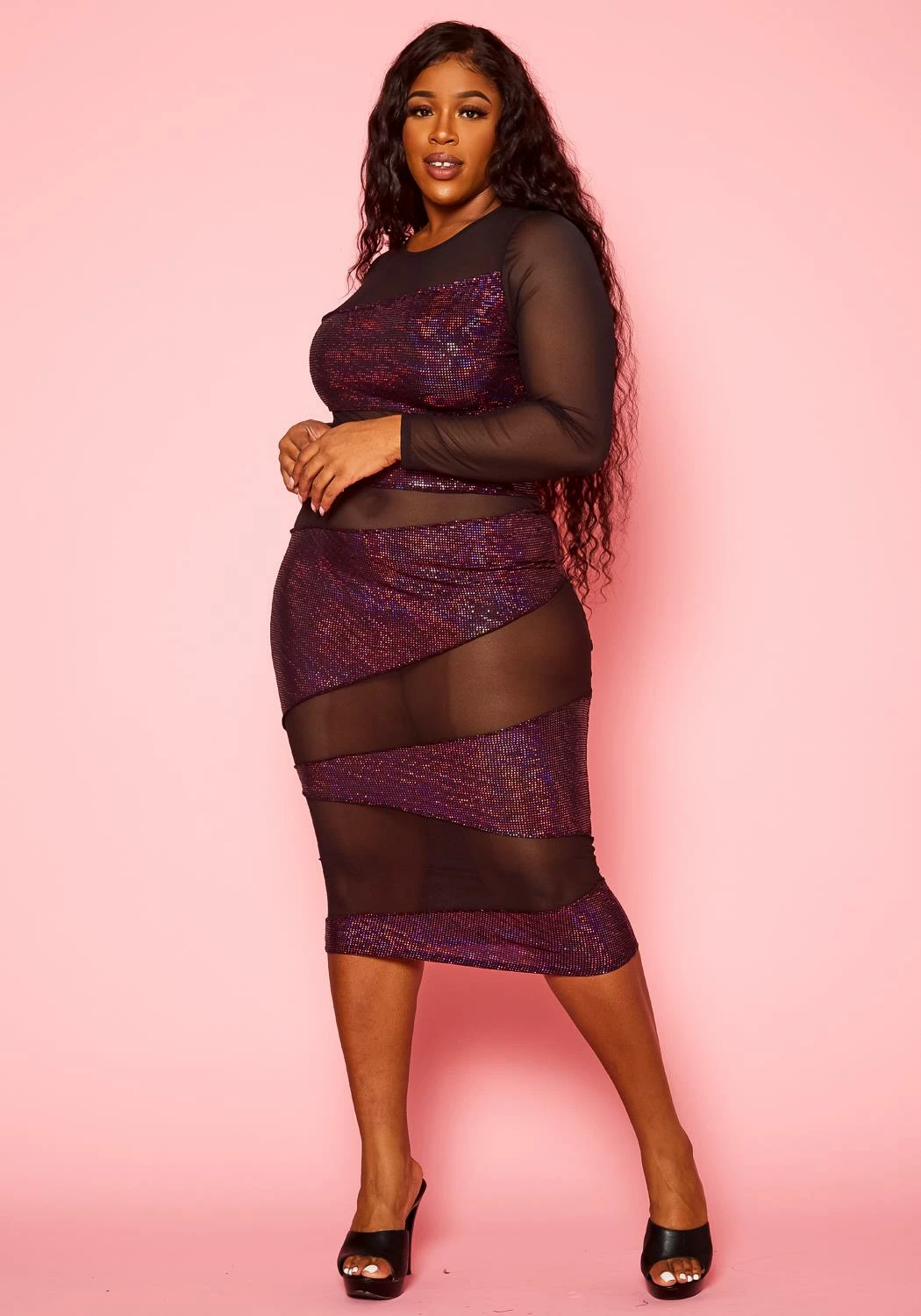 Best of both worlds plus size women’s bodycon dress which features a half metallic and half mesh design. Very sexy front splice design, full metallic back design, fitted mesh long sleeves and round neck style.