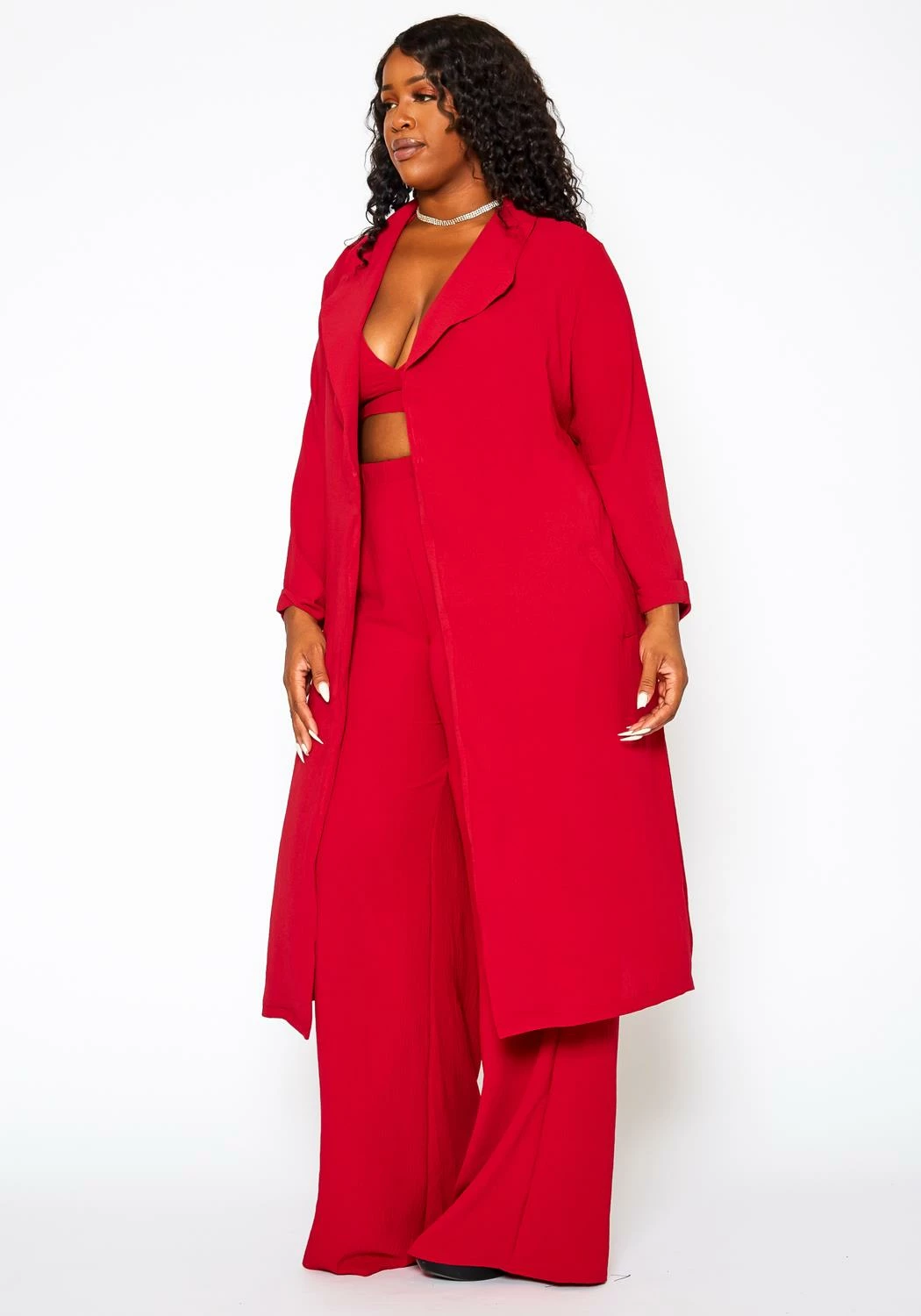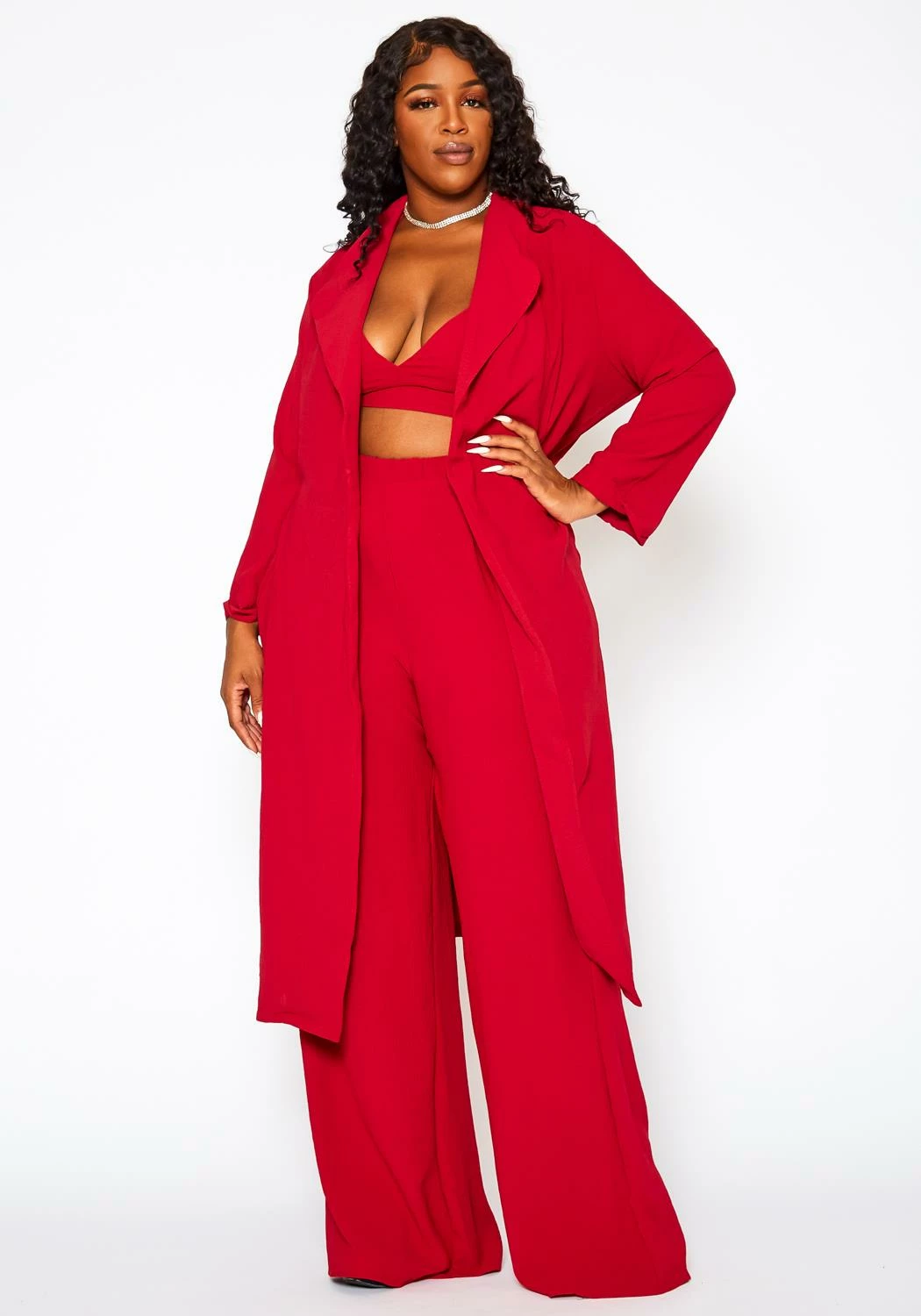 Plus size women’s set, featuring a halter crop top, deep v-neck hem, back tie up closure paired with a open front style duster with back tie detail, waterfall drape-front hem & high waist wide leg pants.