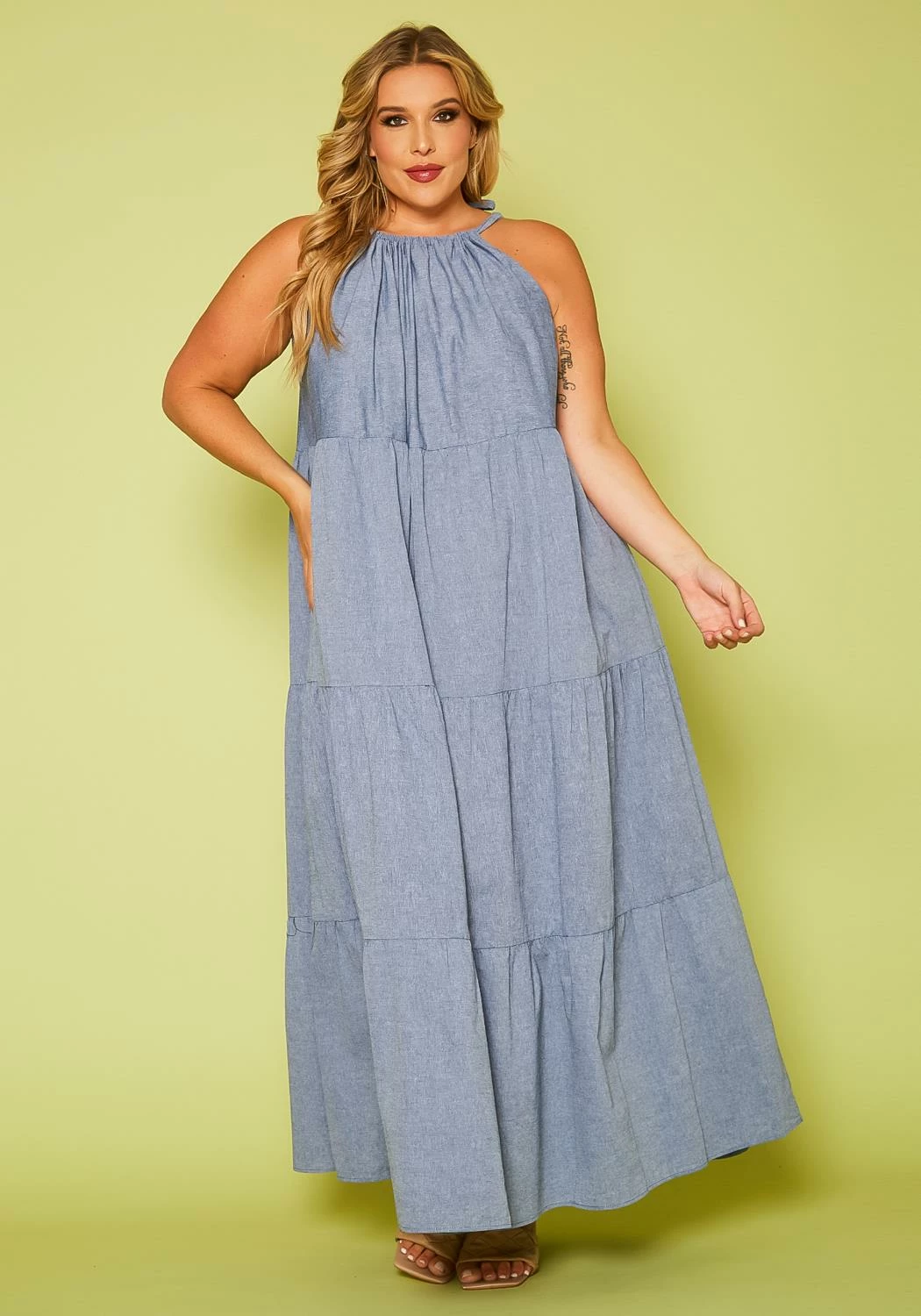 Simple plus size women’s maxi dress in wide flare design, tiered stitch hem, halter neck tie closure, sleeveless design and lightweight material.