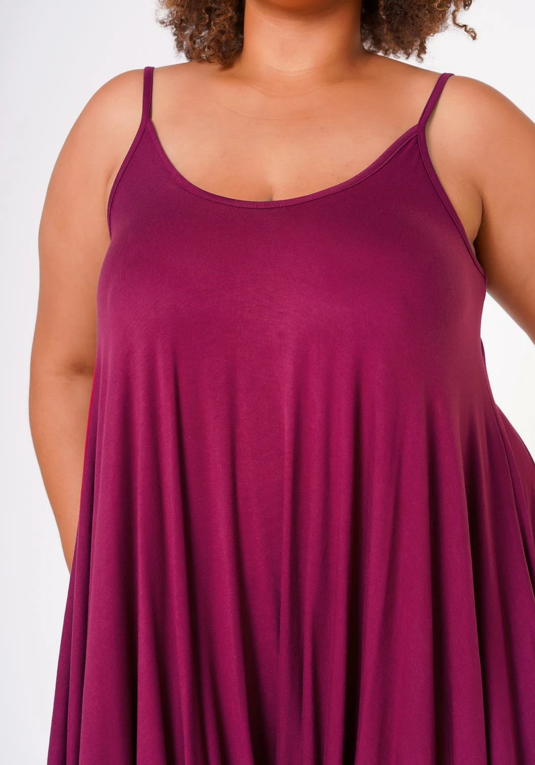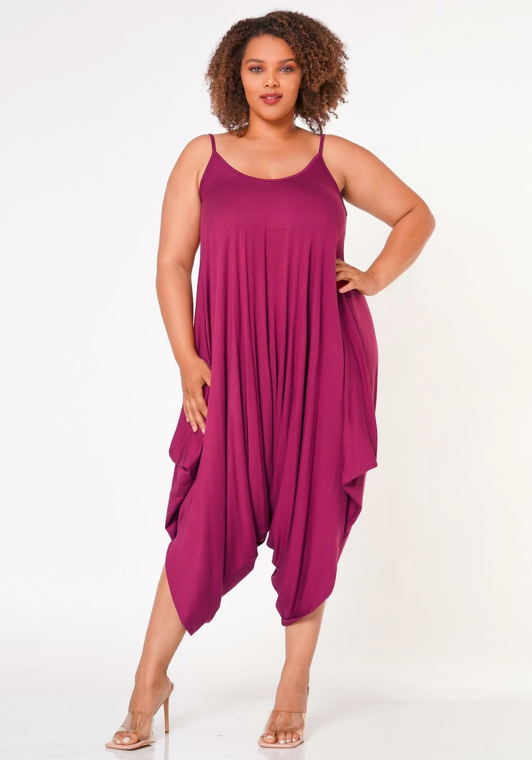 Lounge essential cami jumpsuit for plus size women in harem design, cami shoulder straps, U-neckline, capri length and relaxed fitting.