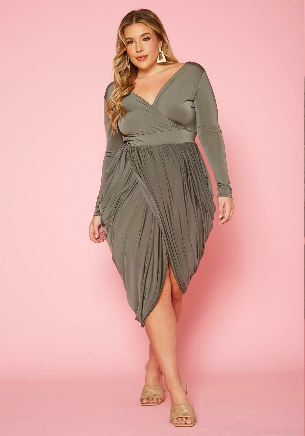 Romantic plus size women’s party midi dress which features harem draped design, v-neck style, fitted long sleeves, centered split hem and fit to flare style.
