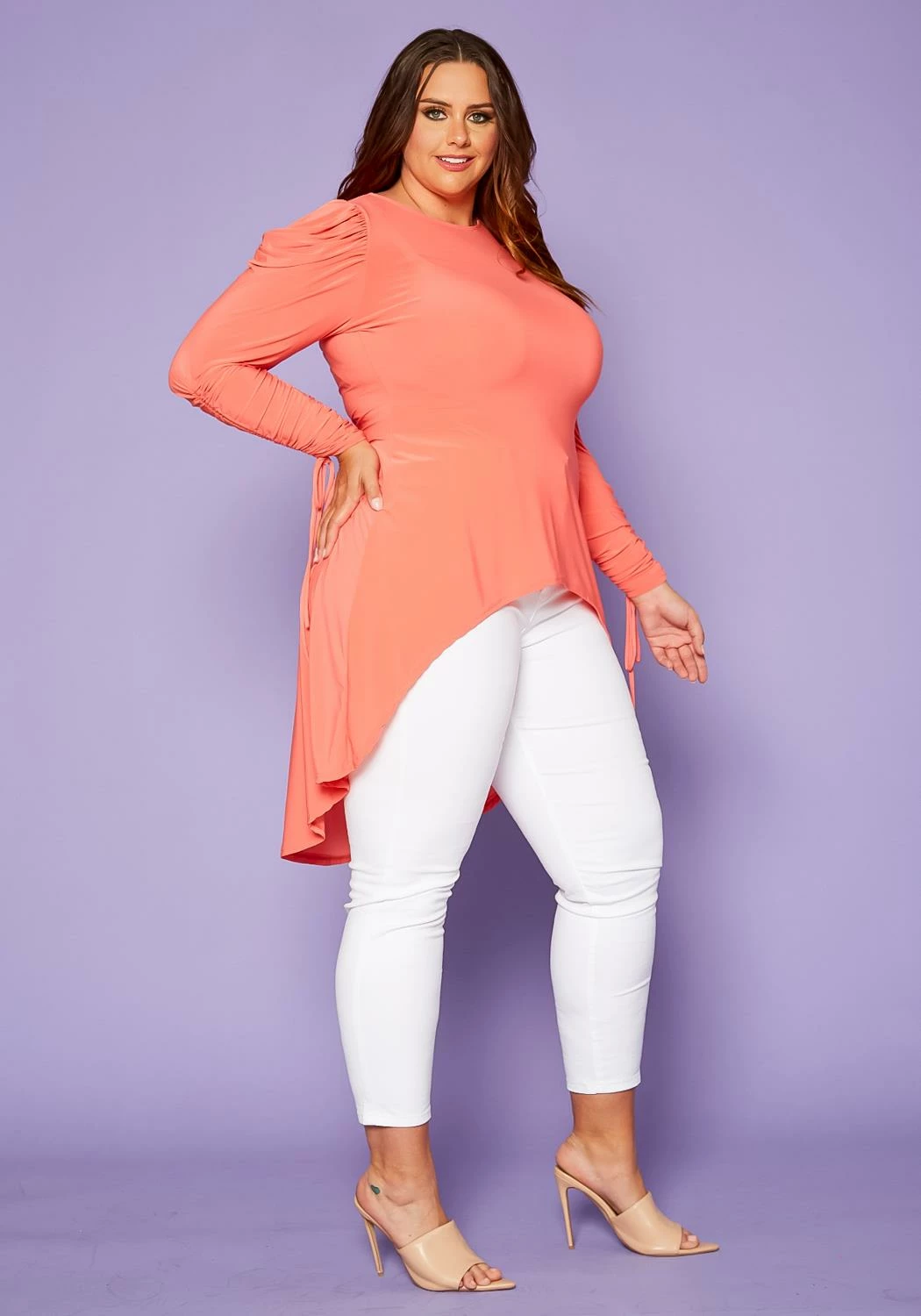 Plus size women’s top in high-low style featuring a round neck hem, puffed shoulders, ruched sleeves with drawstring detail.