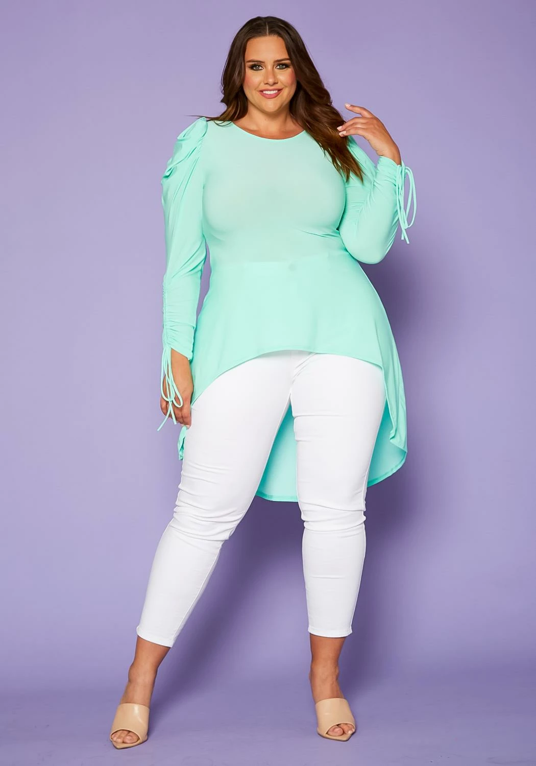 Plus size women’s top in high-low style featuring a round neck hem, puffed shoulders, ruched sleeves with drawstring detail.