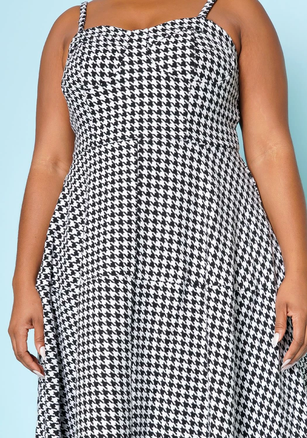 Plus size women’s maxi dress in houndstooth pattern, cami shoulder straps, sweetheart neckline and back zipper closure.