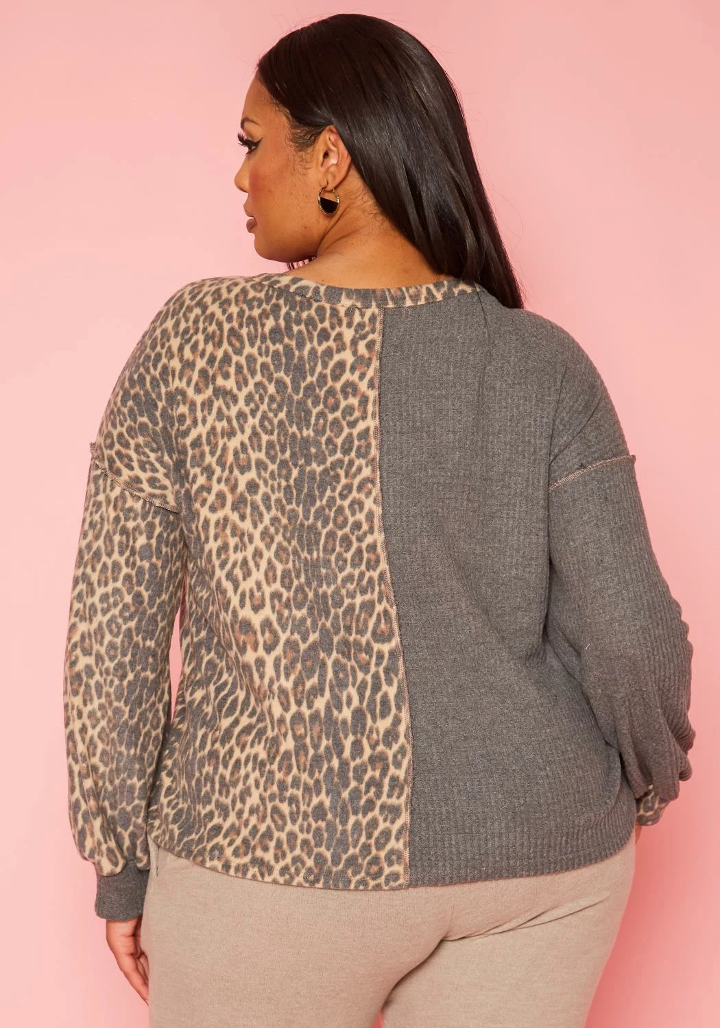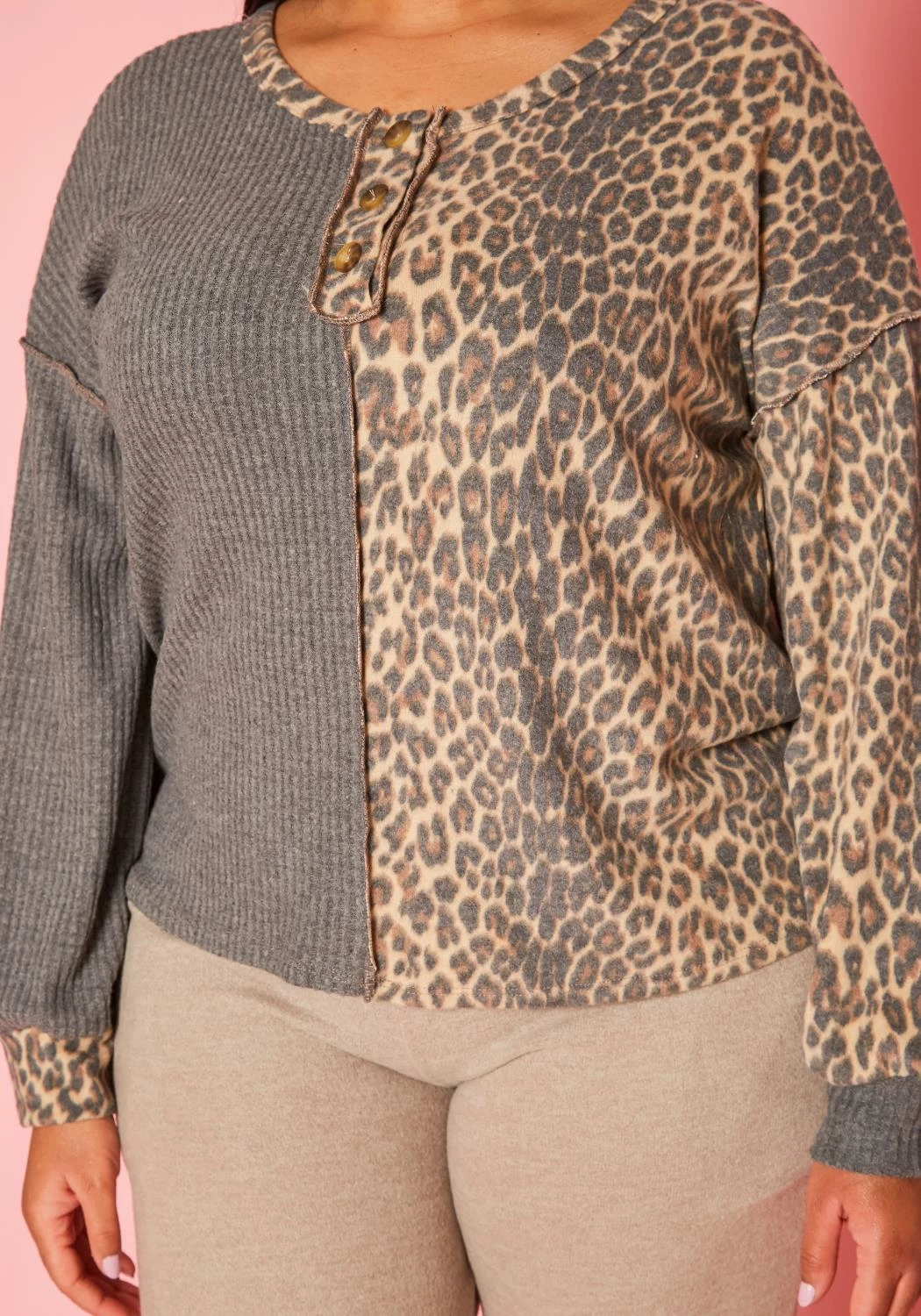 Plus size women’s casual shirt in leopard splice, crew neck style, button front and loose long sleeves.