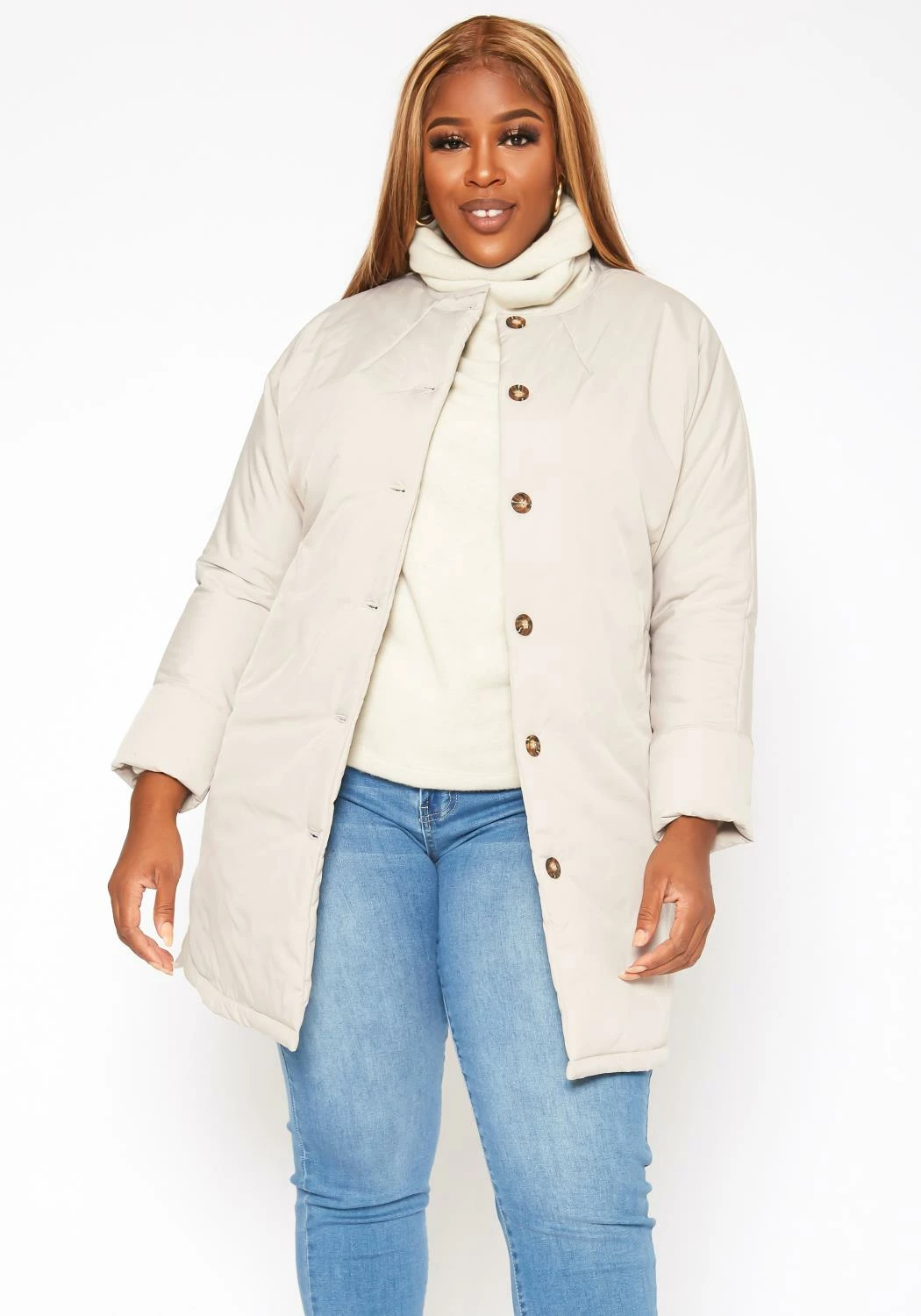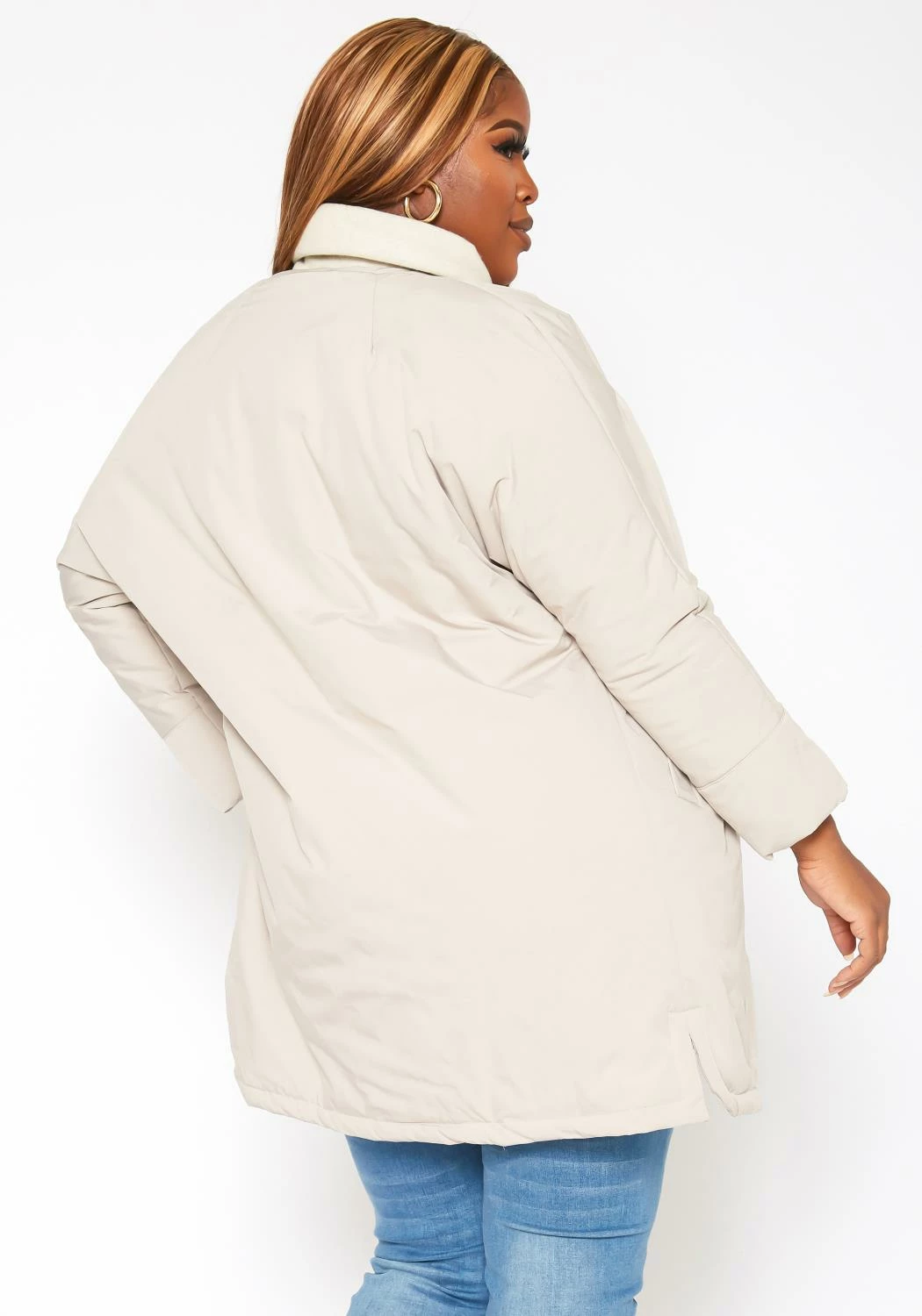 Plus size women’s puffy jacket with mandolin collar neck, button front closure, pocket hem and hip length.