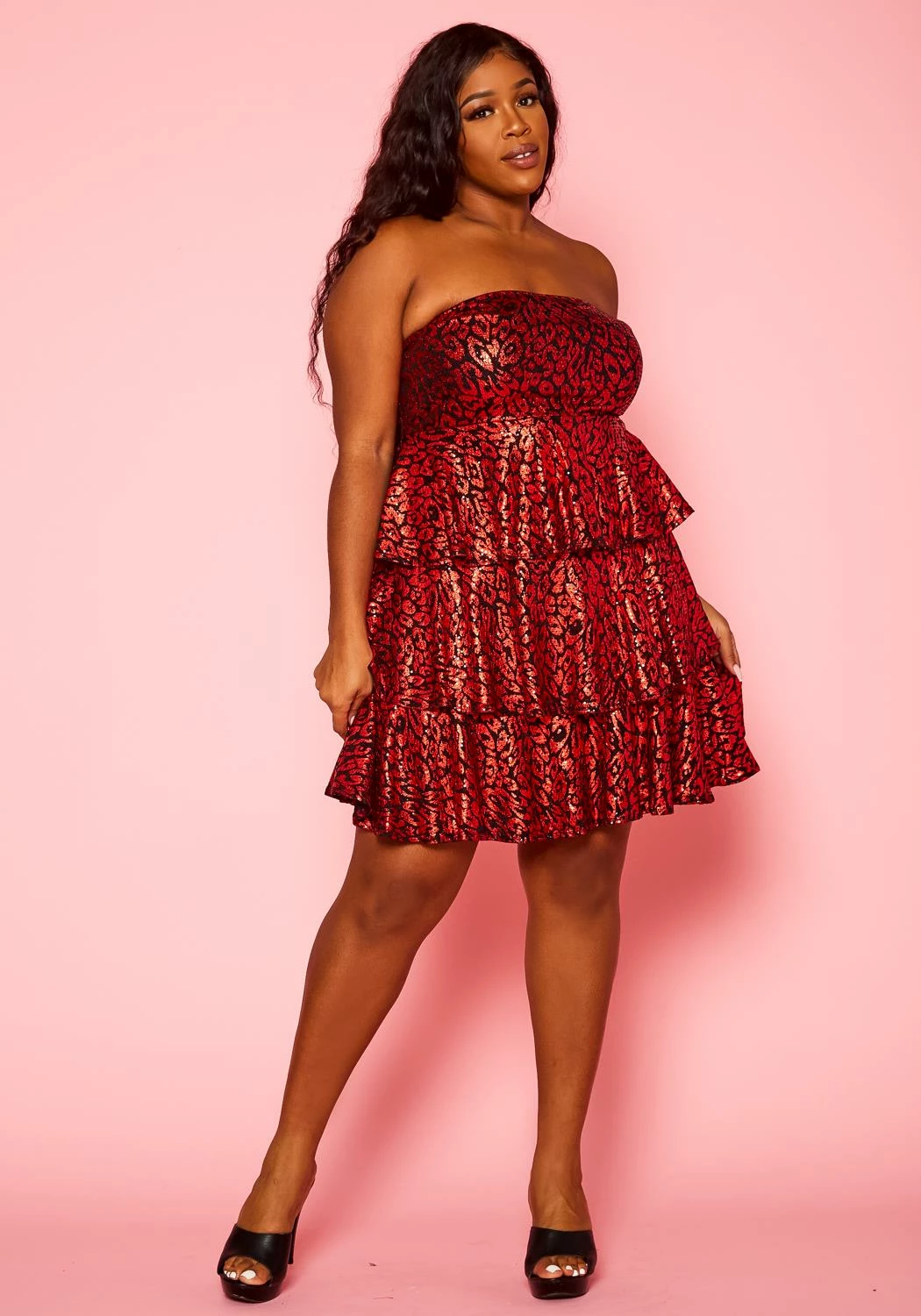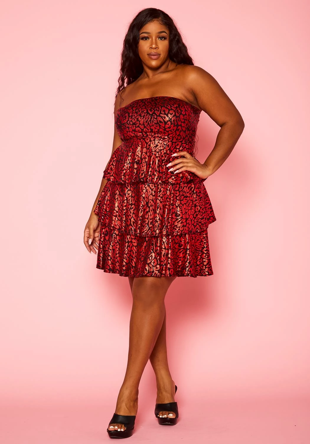 Life of the party red metallic mini dress with leopard pattern, flattering triple tier ruffle flare design and tube fitting.