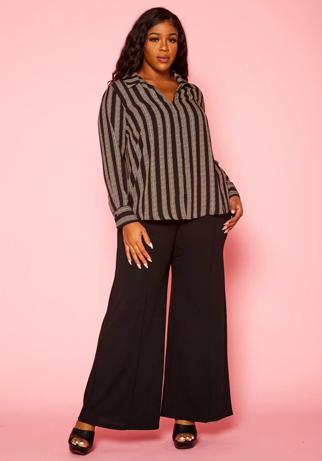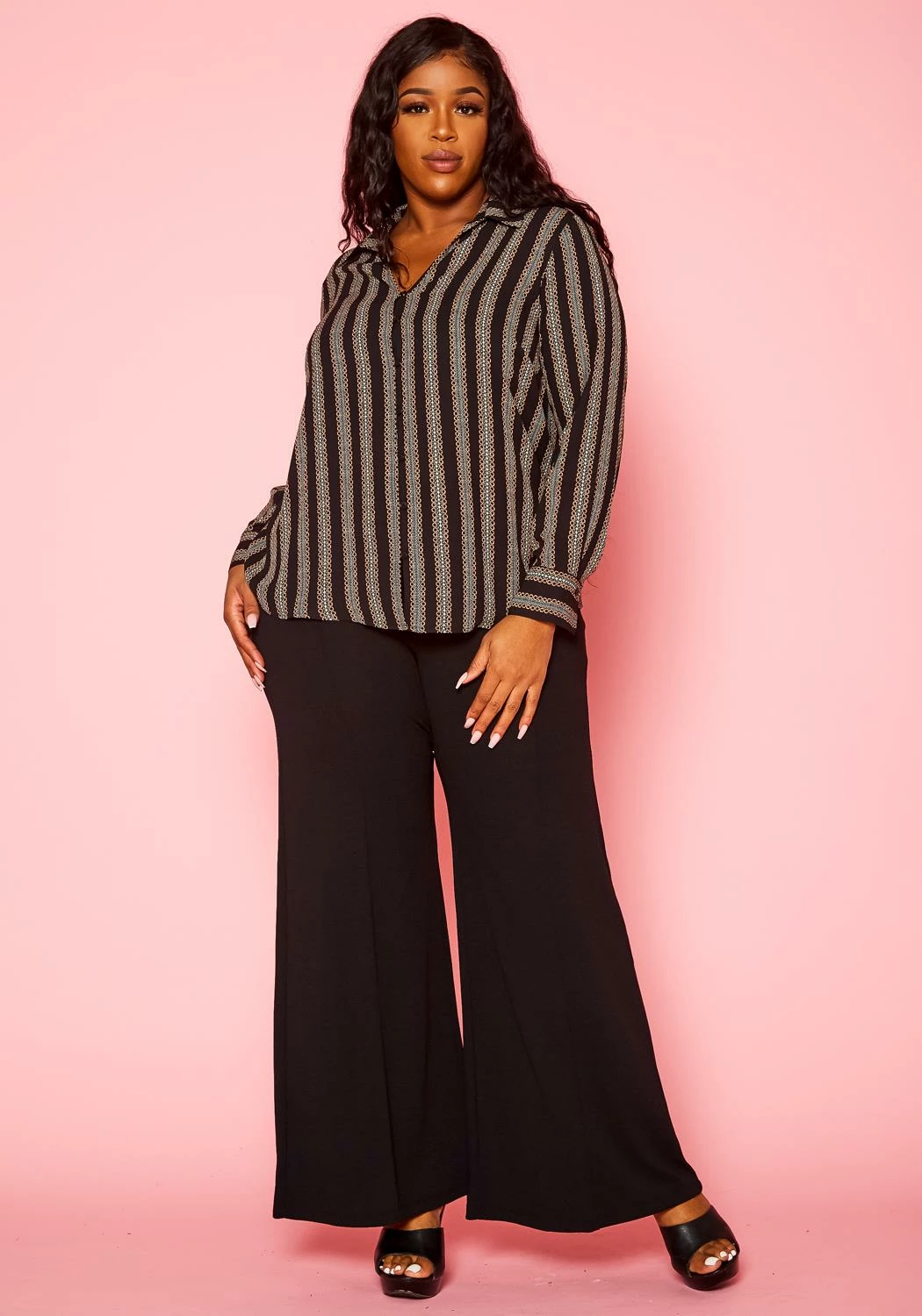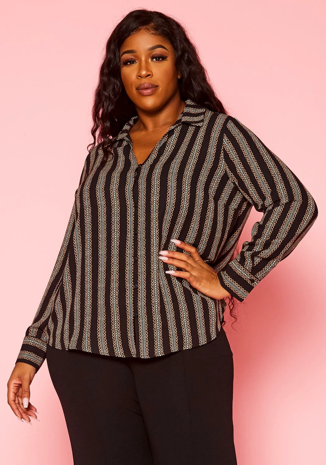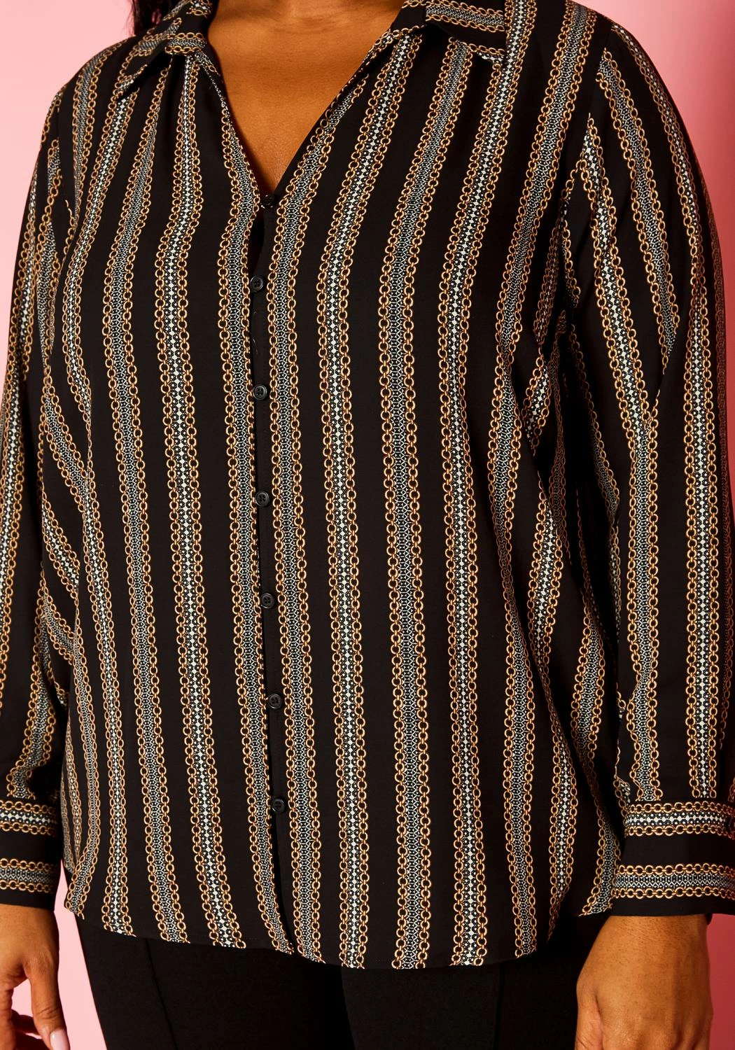 Contemporary plus size women’s collar blouse with minimal chain link print, v-neckline, front button closure, buttoned wrist cuffs and casual loose fitting.