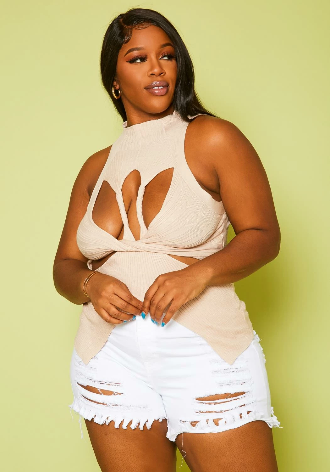 Essential ribbed knit top for plus size women, featuring a mock neck hem, sleeveless design & front cut out and middle slit style.