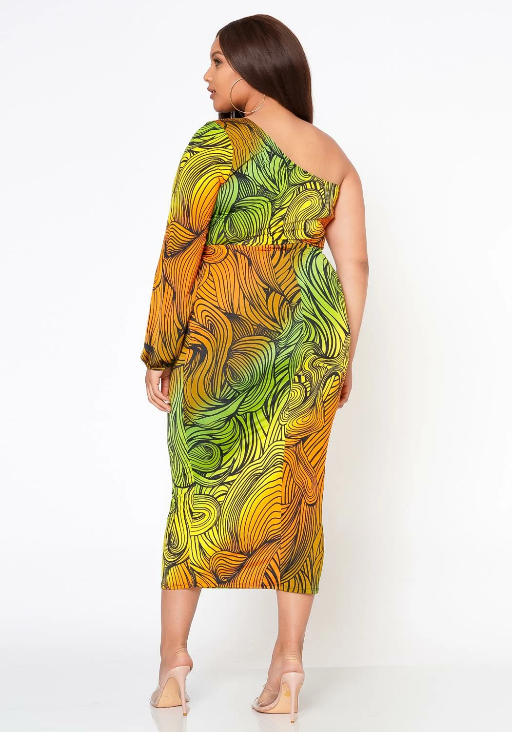 Unique plus size women’s bodycon midi dress in multi color-abstract pattern, single long sleeve and keyhole front cut-out hem.