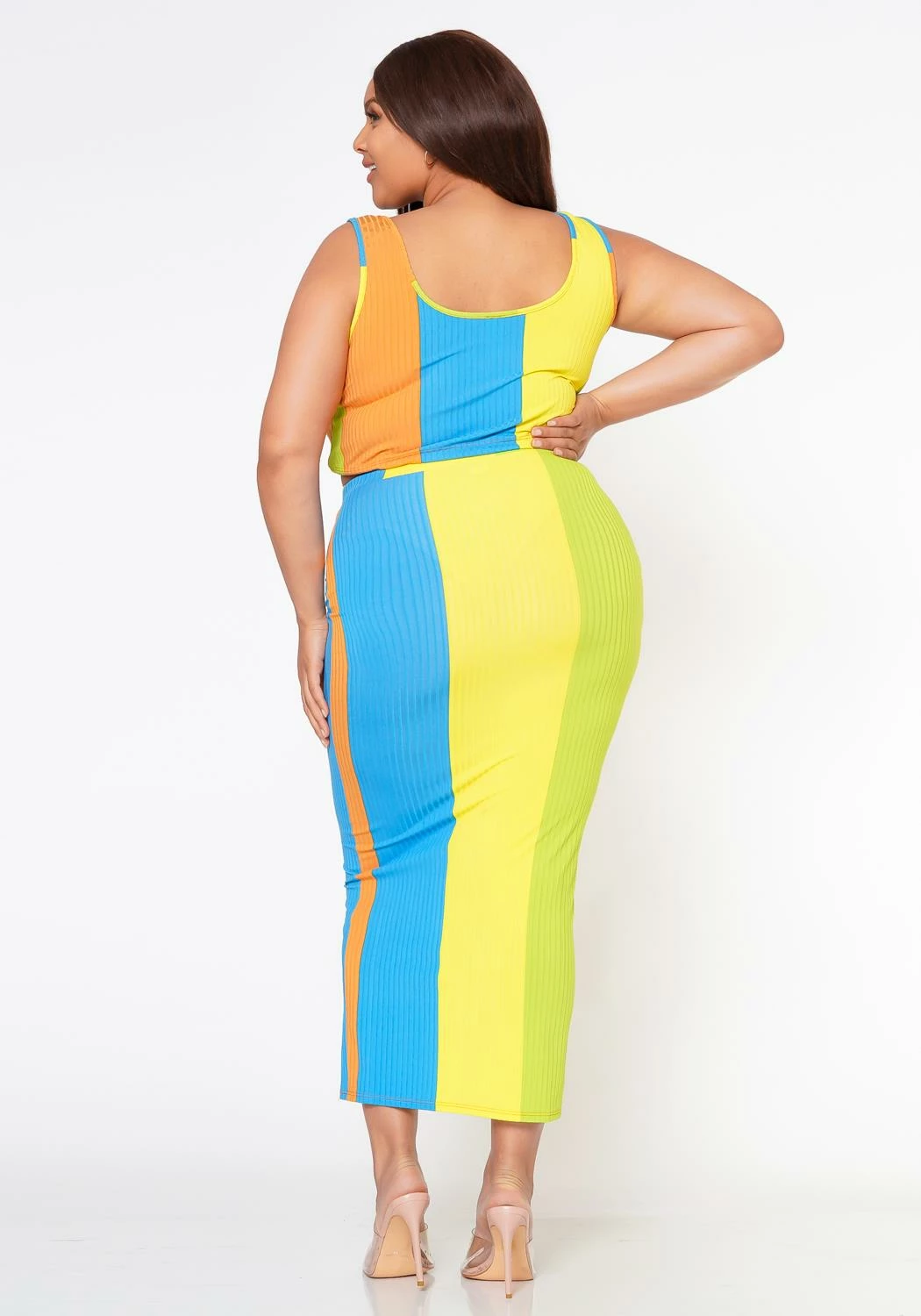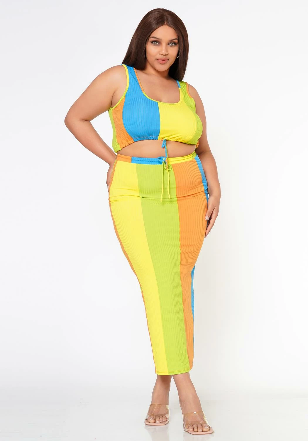 Trendy plus size women’s lounge set in multi color. Features a scoop neckline tank top with waist drawstring hem and matching high waist bodycon midi skirt with waist drawstring hem.