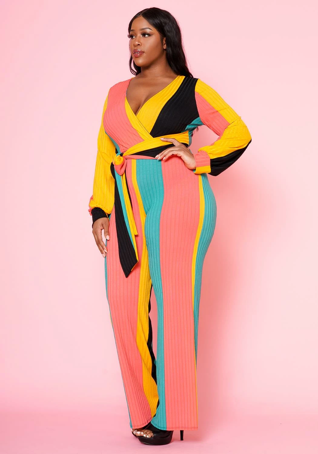 Effortless plus size women’s jumpsuit in multi color pattern, comfy ribbed material, v-neck style, long sleeves, waist tie hem and flare leg hem.